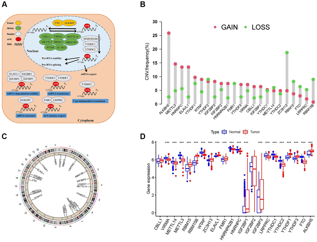 To explore the extent of mutation of 23 m6A regulators in sarcoma, we performed CNV analysis and labeled the positions of 23 m6A regulators in human chromosomes. Gene Ontology (GO) enrichment analysis based on 23 m6A regulators was performed. Combined with the datasets of sarcoma samples in TCGA and the datasets of muscle and adipose tissues in UCSC, we performed differential analysis. Immediately afterward, we combined the survival data of patients with sarcoma with K-M analysis for each m6A regulator and explored the interrelationships between the m6A regulators. Based on the results of the above analysis, an m6A regulator network was established.