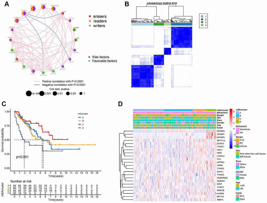 The m6A regulator network describes the association between the 23 m6A regulators, their interactions, and their prognostic significance in patients with sarcoma (Figure 3A). The results of the m6A regulatory network indicate that the interaction between writers, readers, and erasers may play unique roles in the formation of different m6A regulator expression patterns and affect the prognosis of patients with sarcoma [21, 22]. We used non-negative matrix factorization (NMF) consistent clustering to classify the sarcoma samples and identified four m6A modification clusters (Figure 3B and Supplementary Figure 3A–3J), namely, m6A-cluster-A, m6A-cluster-B, m6A-cluster-C, and m6A-cluster-D. K-M analysis showed that m6A-cluster-C had a significant survival advantage, while m6A-cluster-D showed a poor prognosis (Figure 3C). A heat map showed the differential expression patterns of 23 m6A regulators in four different m6A modification clusters (Figure 3D).