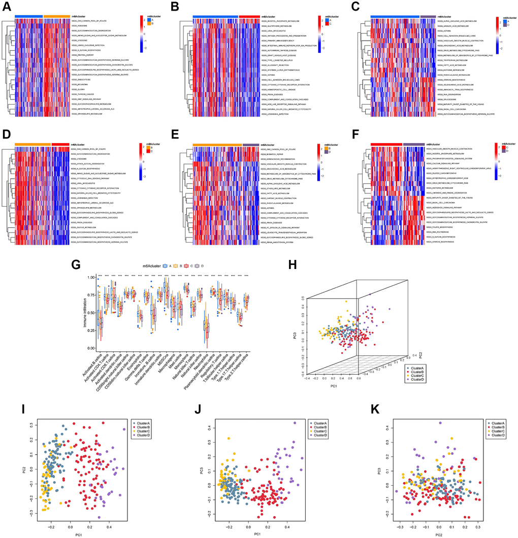 To explore the biological behavior of the four different m6A modification types, we performed pairwise gene set variation analysis (GSVA) enrichment analysis (Figure 4A–4F). GSVA results showed that m6A-cluster-A was significantly rich in material metabolism (amino acid and lipid metabolism) and human diseases (immune-related, such as systemic lupus erythematosus and primary immunodeficiency). It is worth noting that material metabolism-related processes, especially glucose metabolism, are enriched in m6A-cluster-B. The pathways enriched by m6A-cluster-C are phosphoinositide transduction and metabolism and human diseases (circulatory system related). The pathways enriched by m6A-cluster-D are mainly metabolism-related pathways (such as glycan metabolism and lipid metabolism) and human disease-related signaling pathways (basal cell carcinoma and diabetes). Surprisingly, GSVA results showed that the signaling pathways with high expression between different clusters were mostly material metabolism- and immune-related, further confirming a direct or indirect link between m6A regulator expression patterns and TIME. In addition, we constructed a visible box-line plot by the “ssGSEA” package to compare the differences in the relative abundance of 28 immune infiltrating cell subpopulations in 4 different m6A clusters (Figure 4G). Statistically significant differences in immune cell infiltration results indicate the reliability of the m6A cluster in elucidating the immunophenotyping of TIME. Three-dimensional PCA (3D PCA) analysis was performed in four different m6A clusters based on the expression of 23 m6A regulators. 3D PCA and its projection on the three planes (Figure 4H–4K) showed that the distribution of four different m6A modification clusters was disorderly.