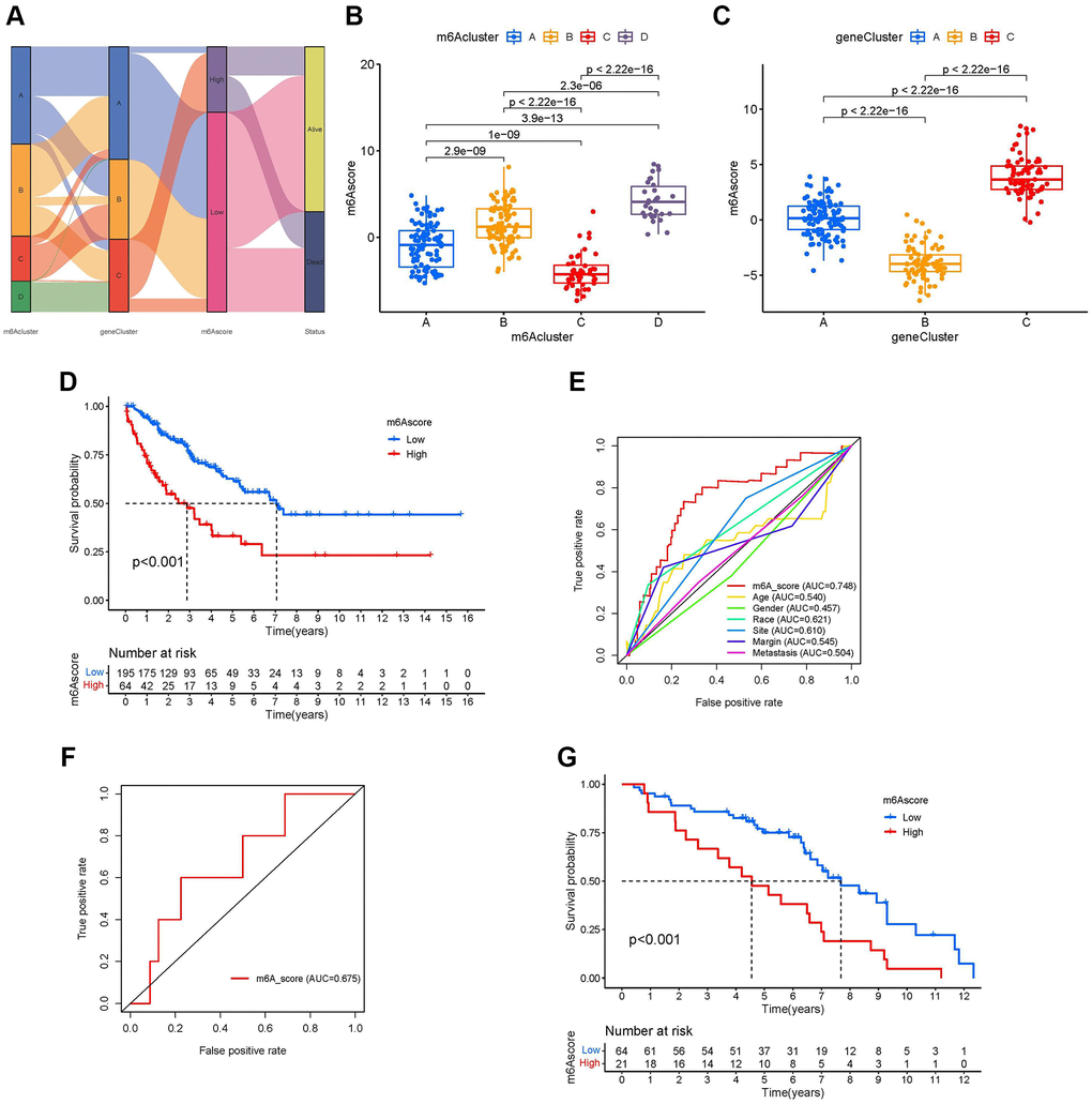 Although our studies have further confirmed the relationship between m6A modification in TIME and prognosis, these analyses cannot predict the pattern of m6A modification in patients with sarcoma and cannot assess the prognosis of these patients. Therefore, we developed a scoring scheme called the m6A score to quantify the m6A regulator expression pattern in each sarcoma patient (Supplementary Table 7). We used a Sankey plot to illustrate the workflow (Figure 6A). The Kruskal-Wallis test showed that there were significant differences in m6A scores between the m6A clusters. The median of m6A cluster C was the lowest, and the median of m6A cluster D was the highest, indicating that a high m6A score may be closely related to the characteristics of material metabolism, while a low m6A score may be related to immune cell infiltration (Figure 6B). At the same time, m6A gene cluster C showed the highest median score of m6A, and m6A cluster B showed the lowest median score (Figure 6C). The results of the K-M curve showed that patients with high m6A scores had a shorter survival time than those with a low score group (Figure 6D). In different clinicopathological characteristics (age, race, sex, site, margin status, and metastasis status), it was further confirmed that the prognosis of patients with high m6A scores was worse than that of patients with low m6A scores (Supplementary Figure 5A–5L). We drew the receiver operating characteristic (ROC) curve to further explore the prediction function of the m6A score for patients with sarcoma. We found that the AUC of m6A score was 0.748, which is much larger than the AUC of other clinicopathological features, and the m6A score can predict the prognosis of patients with sarcoma (Figure 6E). The m6A score was validated in GSE63157, and the AUC value of the validation cohort was 0.675 (Figure 6F). Additionally, the validation cohort GSE63157, survival curves showed that low-risk patients had a favorable prognosis than high-risk patients (P < 0.001, Figure 6G).