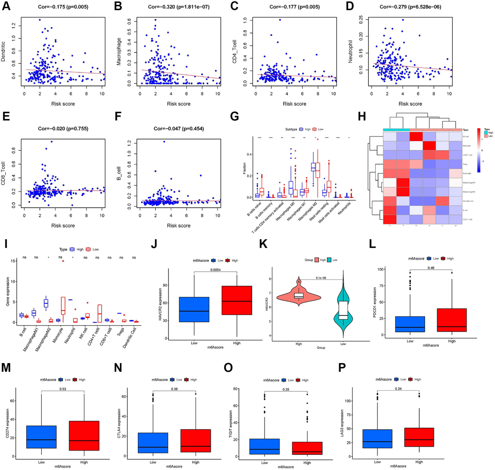 Using the Tumor Immune Estimation Resource (TIMER), we evaluated the association between the prognostic features and immune cell infiltration. The results indicated that DC (Cor = –0.175, P-value = 0.005, Figure 7A), macrophages (Cor = –0.320, P-value <0.001, Figure 7B), CD4+ T cells (Cor = –0.177, P-value = 0.005, Figure 7C), and neutrophils (Cor = −0.279, P-value <0.001, Figure 7D) were significantly negatively correlated with the m6A score. The other two types of immune cells, CD8+ T cells (Figure 7E) and B cells (Figure 7F) were not significantly different from the m6A score. Immune cell infiltration analysis results of TIMER further confirmed that a low m6A score might be related to immune cell infiltration. In addition, using CIBERSORT, we assessed the difference in immune cell infiltration between the high-m6A score group and the low-m6A score group. The results of CIBERSORT showed that the infiltration degrees of activated B cells, memory T cells, CD4+ T cells, M0 and M2 macrophages, and mast cells were higher in the high-m6A score group than in the low-m6A score group; in contrast, the infiltration degrees of naïve B cells, M1 macrophages, and resting mast cells were higher in the low-m6A score group than in the high-m6A score group (Figure 7G). Immune cell infiltration analysis results of CIBERSORT showed that different m6A scores had different immune cell types infiltrated in TIME. Based on the m6A score, we divided six patients from Tianjin Medical University Cancer Institute and Hospital into a low-m6A score group (four samples) and a high-m6A score group (two samples) and plotted their immune cell infiltration heat map (Figure 7H). By analyzing the degree of immune cell infiltration in the external validation set of the six patients, we further confirmed the conclusion that macrophage M2 and neutrophils were higher in the high-m6A score group than in the low-m6A score group (Figure 7I). The results of ICI-related biomarker analysis showed that the expression of TIM-3 (p = 0.005) was higher in the high-m6A score group than in the low-m6A score group (Figure 7J). The validation set GSE63157 high-m6A score group also had a higher level of TIM-3 expression than the low-m6A score group (Figure 7K). However, there was no statistical difference in the expression of PD1 (Figure 7L), PD-L1 (Figure 7M), CTLA4 (Figure 7N), T cell immunoglobulin and ITIM domain (TIGIT) (Figure 7O), and lymphocyte activation gene-3 (LAG3) (Figure 7P) between the high- and low-m6A score groups.