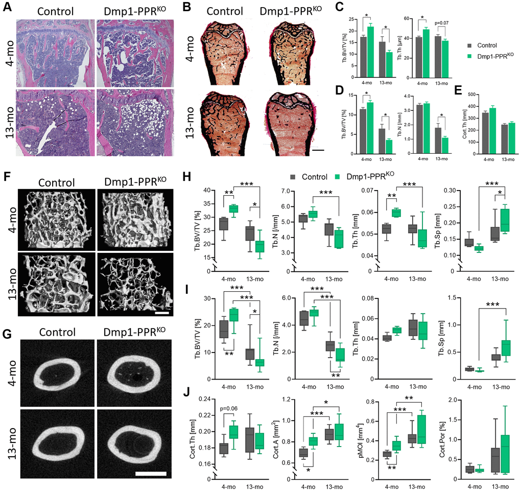 Mice lacking PPR in mature osteoblasts/osteocytes, namely Dmp1-PPRKO, have increased bone mineral density and bone mass by three months of age and they are resistant to both the anabolic and catabolic effects of PTH [22]. To investigate whether PPR signaling in mature osteoblasts/osteocytes is needed to maintain skeletal homeostasis during age-dependent bone loss, we analyzed the skeletons of adult and middle-aged animals. Hematoxylin and eosin (H&E) staining of the tibiae and von Kossa staining of the fifth lumbar (L5) vertebrae and the femora showed significant increase in trabecular bone volume over total tissue volume (BV/TV%) at 4 months, as previously reported for young mice [22]. The increased bone mass was followed by a dramatic bone loss in Dmp1-PPRKO mice at 13 months, as compared to littermate controls (Figure 1A–1D, Table 1, Supplementary Figure 1A). Cortical thickness was similar between Dmp1-PPRKO and controls at both ages (Figure 1E). Micro-computed tomography (μCT) analysis further confirmed the histological data (Figure 1F–1J, Table 2). At 4 months of age, in Dmp1-PPRKO mice there was a significant increase in BV/TV% in L5 and distal femur (Figure 1H–1I) and a significant increase in trabecular thickness (Figure 1H) in vertebral bones. In contrast, at 13 months of age, BV/TV% in both sites (L5 and femurs) were significantly decreased in Dmp1-PPRKO mice compared to littermate controls (Figure 1H, 1I). The significant reduction in these trabecular parameters was still present in KO animals at 16 months of age (Supplementary Figure 1B). In Dmp1-PPRKO mice, bone volume of L5 and the distal femora decreased by 41% and 71%, respectively, from 4 to 13 months, whereas in control animals this decrease was 12% and 42%, respectively (Figure 1H, 1I). At 13 months of age, trabecular separation was also significantly increased in the L5 of Dmp1-PPRKO mice (Figure 1H) and trabecular number (Tb.N) was significantly decreased in the distal femora (Figure 1I) of Dmp1-PPRKO mice compared to controls. Taken together this data revealed a marked age-dependent trabecular bone loss in the absence of PPR signaling in mature osteoblasts/osteocytes.