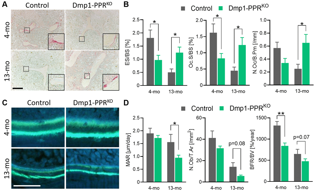 To delineate the cellular mechanism of the age-related osteopenia in the Dmp1-PPRKO animals, we performed histomorphometric analysis on the L5 and the femora of adult and middle-aged mice. As shown in Figure 1C–1E, histomorphometric analysis confirmed the decrease in trabecular BV/TV% and Tb.N in male Dmp1-PPRKO mice at 13 months, both in axial and appendicular sites. Tartrate resistant acid phosphatase (TRAP) staining on the distal femora of these mice showed relatively fewer osteoclasts per bone perimeter at 4 months, but strikingly more TRAP-positive cells at 13 months in Dmp1-PPRKO animals as compared with controls (Figure 2A–2B). The significant increase in the number of TRAP-positive osteoclasts was also present in the proximal tibiae of 20-month-old Dmp1-PPRKO female mice compared with control littermates (Supplementary Figure 2A). These findings were further supported by a significant reduction in osteoclast activity, such as erosion and osteoclast surface per bone surface, in 4-month-old Dmp1-PPRKO mice but a significant increase of all these parameters at 13 months of age (Figure 2B, Table 1). Bone formation rate (BFR) over bone volume (BFR/BV) was significantly decreased in Dmp1-PPRKO at 4 months and mineral apposition rate (MAR) was significantly reduced in 13-month-old Dmp1-PPRKO mice compared to controls (Figure 2C–2D, Table 1). These results indicate that, in the absence of PPR signaling in mature osteoblasts/osteocytes, there is an age-dependent increase in osteoclast numbers and activity and age-independent decrease in osteoblast activity resulting in increased bone resorption and bone loss.