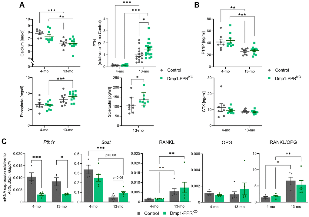 The main function of PTH is to maintain mineral homeostasis and it is still unclear whether mature osteoblasts/osteocytes directly contribute to mineral-ion homeostasis. To investigate if lack of PPR signaling in mature osteoblasts/osteocytes impaired mineral ions homeostasis, we measured serum levels of calcium, phosphate and PTH in adult and middle-aged mice. Biochemical analysis of male Dmp1-PPRKO and littermate control mice showed normal calcemia and phosphatemia at 4 and 13 months of age (Figure 3A), demonstrating that PPR in mature osteoblasts/osteocytes is not required to maintain mineral-ion homeostasis. In both control and Dmp1-PPRKO, with age, there was a significant decrease in serum calcium and an increase in serum PTH, similar to what has been observed in older adult mice. PTH levels were similar between Dmp1-PPRKO and controls at 4 months of age (Figure 3A), whereas they were significantly increased in Dmp1-PPRKO mice at 13 months of age (Figure 3A), indicating a possible resistance to PTH. This increase in serum PTH in Dmp1-PPRKO was not observed in 13-month-old female mice (Supplementary Figure 3B), suggesting the sex-dependent difference. Interestingly, phosphate serum levels significantly increased with age in Dmp1-PPRKO mice but not in controls (Figure 3A). Serum markers of bone formation, procollagen type 1 N-terminal propeptide (P1NP), were significantly reduced in both male Dmp1-PPRKO and controls at 13 months whereas markers of bone resorption, C-terminal telopeptide of type I collagen (CTX), were unchanged in both mice groups at both ages (Figure 3B), despite the significant increase in osteoclast numbers and activities present in Dmp1-PPRKO mice at 13 months of age, as shown in Table 1 and Figure 2B.