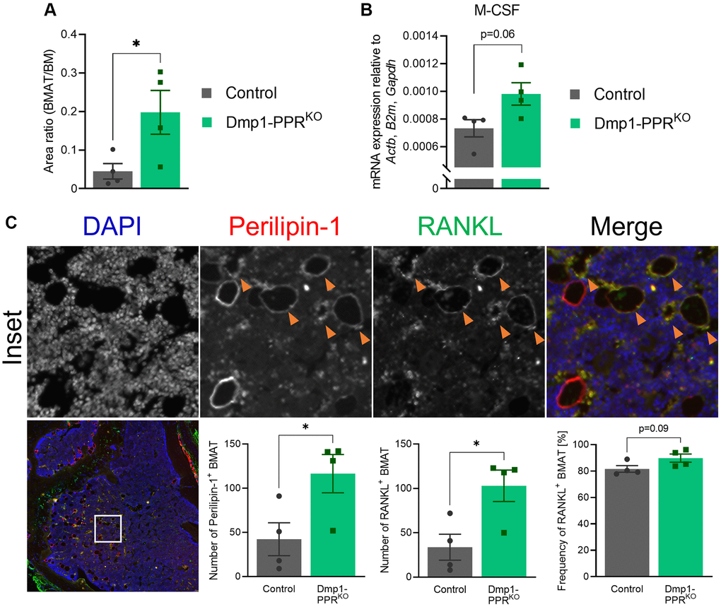 As demonstrated in Figure 5D, treatment with serum from 13-month-old Dmp1-PPRKO mice promoted adipogenic differentiation of BMSCs in vitro. To examine if there was any change in marrow adiposity in these mice, we performed histological analysis on bone marrow. In Dmp1-PPRKO male animals, at 13 months of age, there was a significant increase in marrow adiposity (Figures 1A, 4A). Since marrow adipocytes have been reported as a source of RANKL [26, 27], we analyzed RANKL expression in marrow adipocytes by immunofluorescence staining. Staining of RANKL along with an adipocyte marker, perilipin-1, revealed that the number of RANKL+ marrow adipocytes was markedly increased in Dmp1-PPRKO compared to control male mice (Figure 4C). However, the ratio of RANKL+ adipocytes over total adipocytes was unchanged between control and mutant animals, suggesting that the increase in the number, but not the frequency, of RANKL+ adipocytes contributed to the increased osteoclast numbers in KO mice. It has also been reported that bone marrow adipocytes express M-CSF [28]. Interestingly, we found that M-CSF expression was upregulated (1.3-fold, p = 0.06) in the bone marrow of male Dmp1-PPRKO mice as compared to controls (Figure 4B). This may indicate that the increased marrow adiposity also contributed to the upregulation of M-CSF in the middle-aged mutant mice. Expression of RANKL was unchanged in the bone marrow of 13-month-old male mice (Supplementary Figure 6A). Interestingly, the marrow adiposity was unchanged between female control and Dmp1-PPRKO at 20 months of age, suggesting sexual dimorphism (Supplementary Figure 2B).