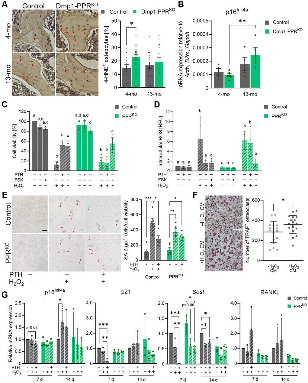 Aging is characterized by reduced skeletal mass and increased oxidative stress and recent studies identified senescence and senescent osteocytes as important players in age-dependent bone loss [32, 48]. The aging process comprises not only cellular dysfunction and genomic instability but also stem cell exhaustion. Several studies have demonstrated that the decline in bone formation that occurs with age, both in humans and animal models, is invariably associated with reduced proliferation and differentiation of mesenchymal stem cells. Here we report that the absence of PPR expression in mature osteoblasts/osteocytes in mice induces a significant increase in the number of 4-HNE+ osteocytes in 4-month-old mutant mice compared to control littermates and a marked increase in p16Ink4a expression at 13 months of age. These findings suggest that PTH protects osteocytes from early onset of oxidative-stress. Further studies are needed to unveil the underlying molecular mechanism.