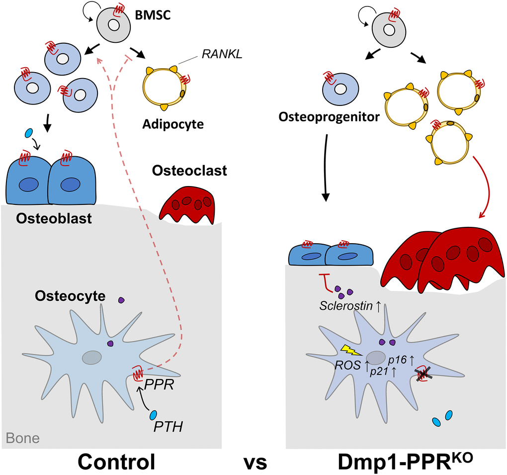 Mice with constitutively active PPR in osteocytes display increased trabecular bone mass, increased osteoblast number, and decreased Sost/sclerostin expression [20, 21] whereas mice lacking RANKL in osteocytes have high bone mineral density and osteopetrosis [14, 15], demonstrating an important role for osteocytes in bone remodeling. We have previously generated mice with conditional knockout (KO) of the PPR predominantly in osteocytes by using the 10-Kb dentin matrix protein 1 (Dmp1) promoter to drive Cre recombinase expression in PPR-floxed mice (Dmp1-PPRKO) [22]. At 3months of age, Dmp1-PPRKO mice show normal serum calcium, phosphate, and PTH, suggesting that under physiological conditions PPR signaling in osteocytes is not needed to maintain normal mineral homeostasis. These mice display a significant increase in trabecular and cortical bone, indicating that PPR on osteocytes is required for normal bone remodeling. When subjected to intermittent or continuous PTH administration, Dmp1-PPRKO mice generated blunted anabolic and catabolic skeletal responses, indicating that PPR signaling in osteocytes is necessary for full skeletal responses to the hormone [22].