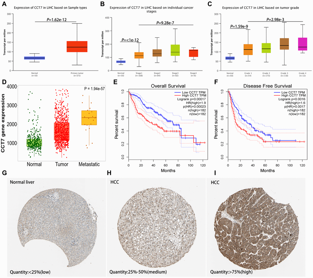 Figure 1. CCT7 levels in HCC and adjacent normal liver tissues. (A) CCT7 mRNA levels were significantly greater in HCC than in normal liver tissues. (B, C) CCT7 mRNA expression increased incrementally with increasing cancer stages (B) and tumor grades (C) in HCC tissues. (D) CCT7 mRNA levels were greater in metastatic than in non-metastatic tumor samples. (E, F) Higher CCT7 mRNA expression was associated with worse OS (E) and RFS (F). (G–I) Representative images from immunohistochemical staining of CCT7 protein expression in normal liver tissues (G, expression quantity <25%), low-expression HCC tissues (H, expression quantity 25–50%) and high-expression HCC tissues (I, expression quantity >75%) from the Human Protein Atlas database.