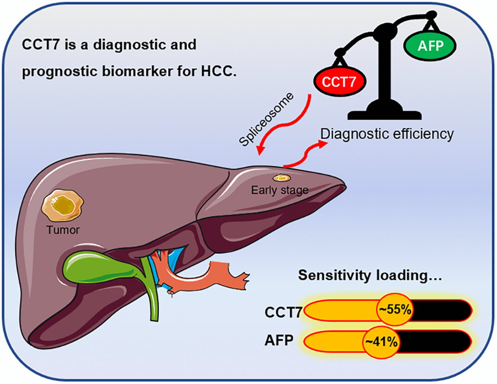 Figure 10. Graphical representation of the diagnostic sensitivity of CCT7 and AFP in HCC patients from TCGA. CCT7 exhibited significantly greater diagnostic value than AFP. CCT7 functions as an oncogene that promotes HCC tumorigenesis and progression through the spliceosome signaling pathway.