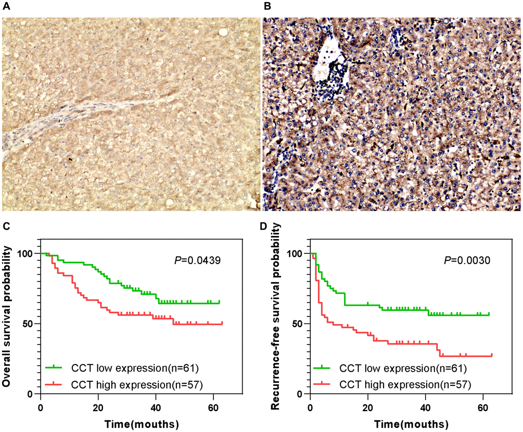 The 118 HCC specimens were cut into 4-μm sections and fixed on glass slides for microscopy. The tissue sections on the slides were then deparaffinized and rehydrated using gradient concentrations of malondialdehyde and ethanol. Next, the slides were immersed in boiling Tris/ethylenediaminetetraacetic acid (pH 9.0) for 20 minutes for antigen retrieval. The slides were subsequently immersed in 3% H2O2 for 10 minutes to inhibit endogenous peroxidase. Then, the slides were incubated with a primary antibody against CCT7 (1:250; 15994-1-AP; Proteintech, Wuhan, China), followed by the secondary antibody (1:50,000; KIT-5010, anti-rabbit/mouse IgG; Maixin Biotechnology Development Co., Ltd., Fuzhou, China), and were washed three times with phosphate-buffered saline. Finally, the sections were stained with 3,3'-diaminobenzidine and substrate chromogen (Dako) for 2 minutes at room temperature and then counterstained with hematoxylin for 40 seconds. Slides incubated only with the secondary antibody without the primary antibody were used as the negative control. The immunohistochemical staining was assessed by two separate pathologists who were blinded to patients’ information. CCT7 protein expression was assessed on the following five-point scale: 0, no positive cells; 1, <25% positive cells; 2, 26–50% positive cells; 3, 51–75% positive cells; and 4, >75% positive cells.