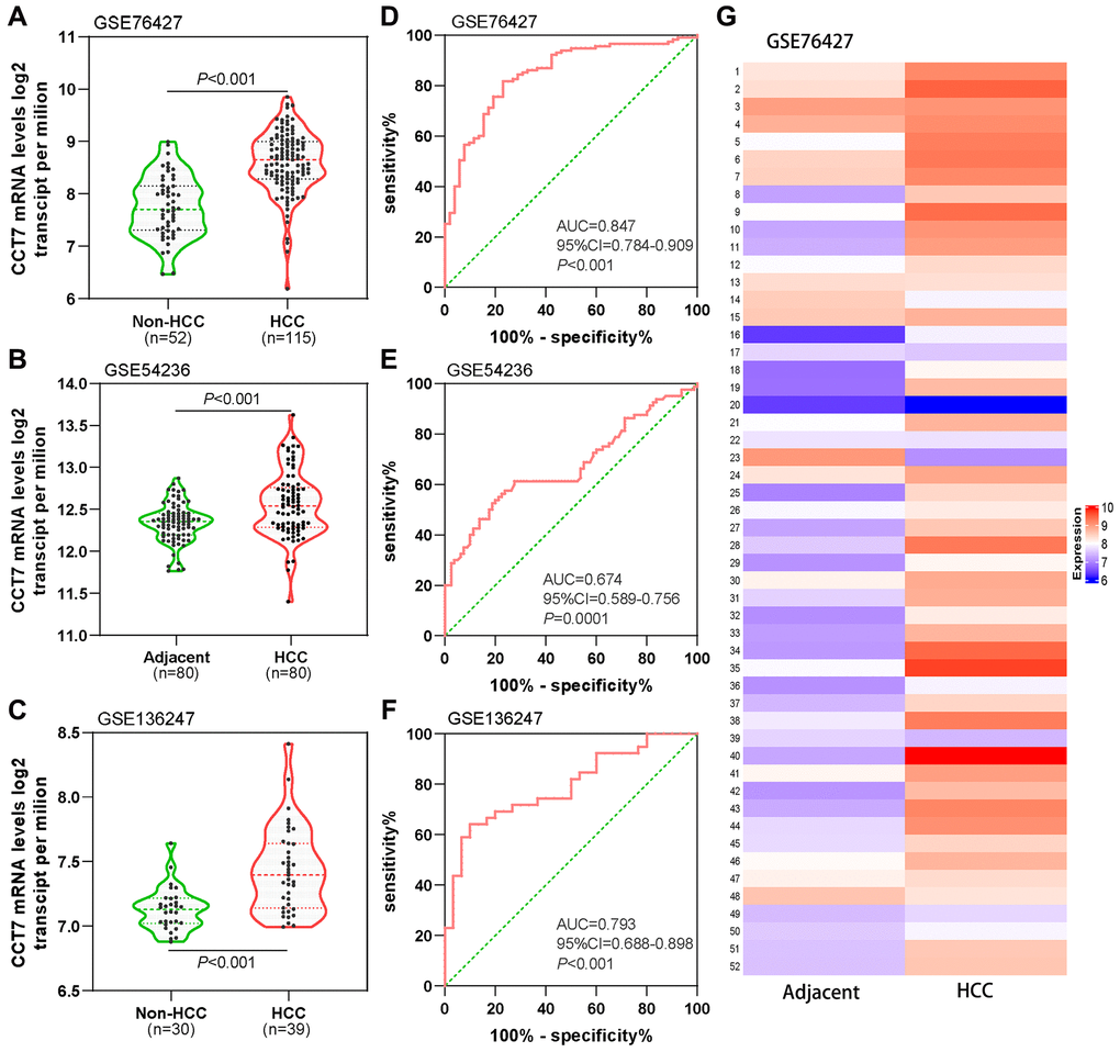 Figure 3. Diagnostic value of CCT7 mRNA expression for HCC in the GEO database. CCT7 mRNA levels were significantly greater in HCC than in non-HCC tissues in GSE76427 (A), GSE54236 (B) and GSE136247 (C). ROC curves exhibited the good diagnostic significance of CCT7 mRNA expression for HCC in GSE76427 (D), GSE54236 (E) and GSE136247 (F). (G) The heat map shows CCT7 mRNA expression in 52 paired HCC and corresponding adjacent normal tissues.