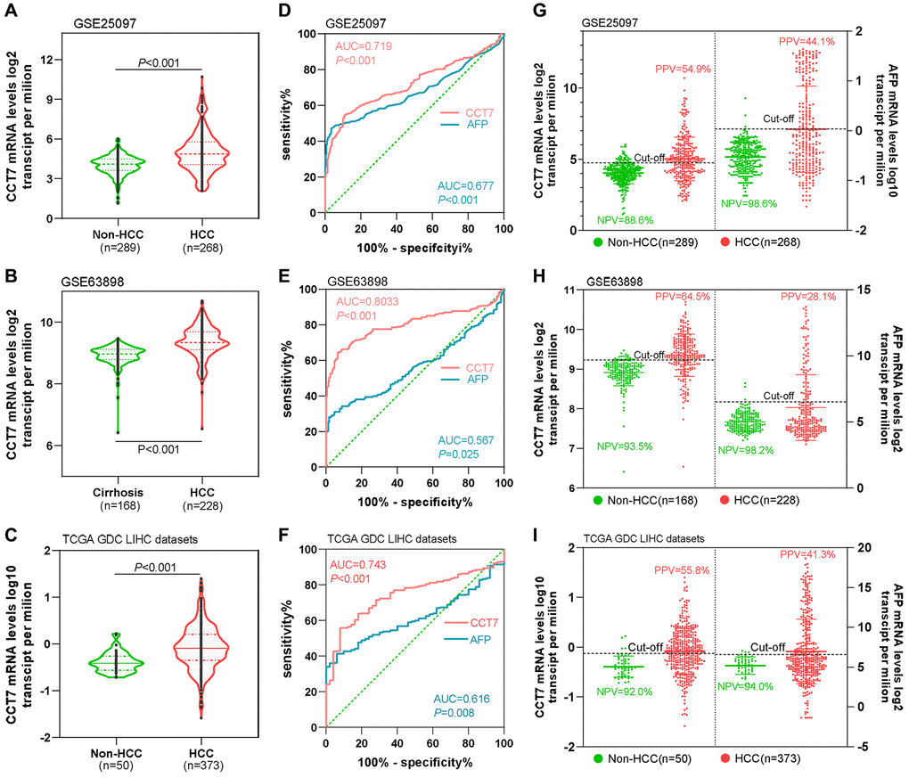 Figure 4. CCT7 has a higher PPV than AFP for HCC diagnosis. CCT7 mRNA levels were significantly greater in HCC than in non-HCC tissues in GSE25097 (A), GSE63898 (B) and TCGA LIHC datasets (C). In ROC curve analyses, CCT7 had a significantly higher AUC than AFP in the GSE25097 (0.719 vs. 0.677, D), GSE63898 (0.803 vs. 0.567, E) and TCGA LIHC datasets (0.743 vs. 0.616, F). CCT7 had a higher PPV than AFP in the GSE25097 (54.9% vs. 44.1%, G), GSE63898 (64.5% vs. 28.1%, H) and TCGA LIHC datasets (55.8% vs. 41.3%, I).