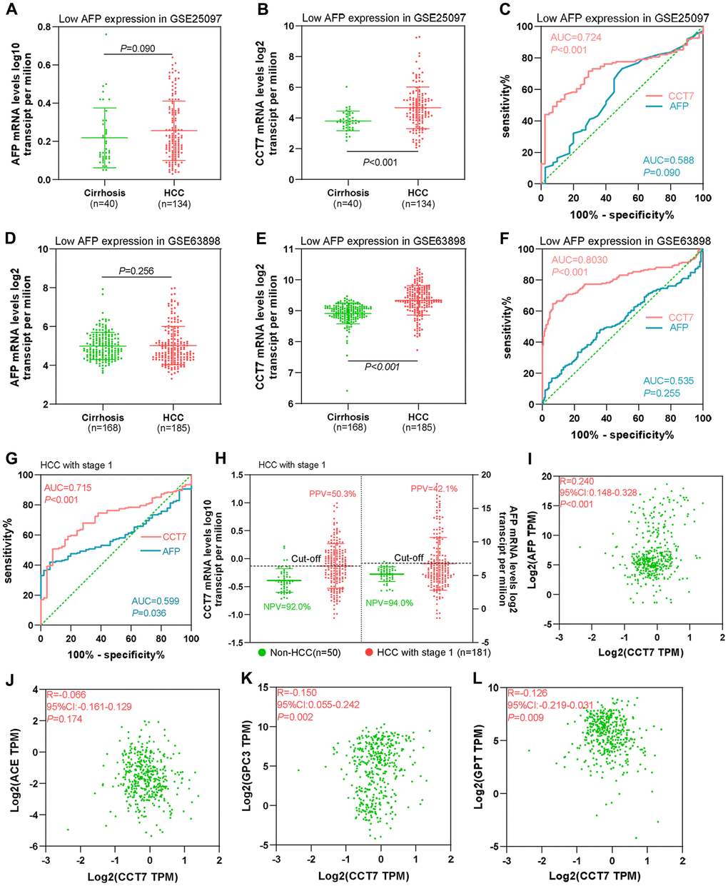 Figure 5. CCT7 has better diagnostic value than AFP for HCC patients with low AFP expression and early-stage disease. (A, B) AFP (A) and CCT7 (B) mRNA expression in tissues from cirrhosis patients (n = 40) and HCC patients with low AFP expression (n = 134) in the GSE25097 dataset. (C) ROC curve analysis showing the diagnostic value of AFP and CCT7 in HCC patients with low AFP expression in the GSE25097 dataset. (D, E) AFP (D) and CCT7 (E) mRNA expression in tissues from cirrhosis patients (n = 168) and HCC patients with low AFP expression (n = 185) in the GSE63898 dataset. (F) ROC curve analysis showing the diagnostic value of AFP and CCT7 in HCC patients with low AFP expression in the GSE63898 dataset. (G) ROC curve analysis showing the diagnostic value of AFP and CCT7 in stage 1 HCC patients from TCGA. (H) The PPV and NPV of AFP and CCT7 in stage 1 HCC patients from TCGA. (I–L) The correlations of CCT7 levels with AFP (I), ACE (J), GPC3 (K) and GPT (L) levels.