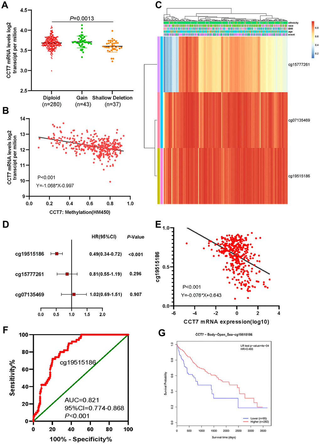 Figure 6. Dysregulated CCT7 expression is associated with DNA methylation status in HCC patients. (A) CCT7 mRNA expression in different copy number groups. (B) The correlation between CCT7 mRNA expression and DNA methylation status. (C) The heat map shows CCT7-related methylated CpG sites in HCC. (D) The forest map shows the correlation between CpG site methylation and survival times in HCC patients. (E) The correlation between CCT7 mRNA expression and cg19515186 methylation status. (F) ROC curve analysis showing the significant diagnostic value of cg19515186 methylation status for HCC in TCGA. (G) Survival analysis showing that higher methylation of cg19515186 was associated with better OS in HCC patients.
