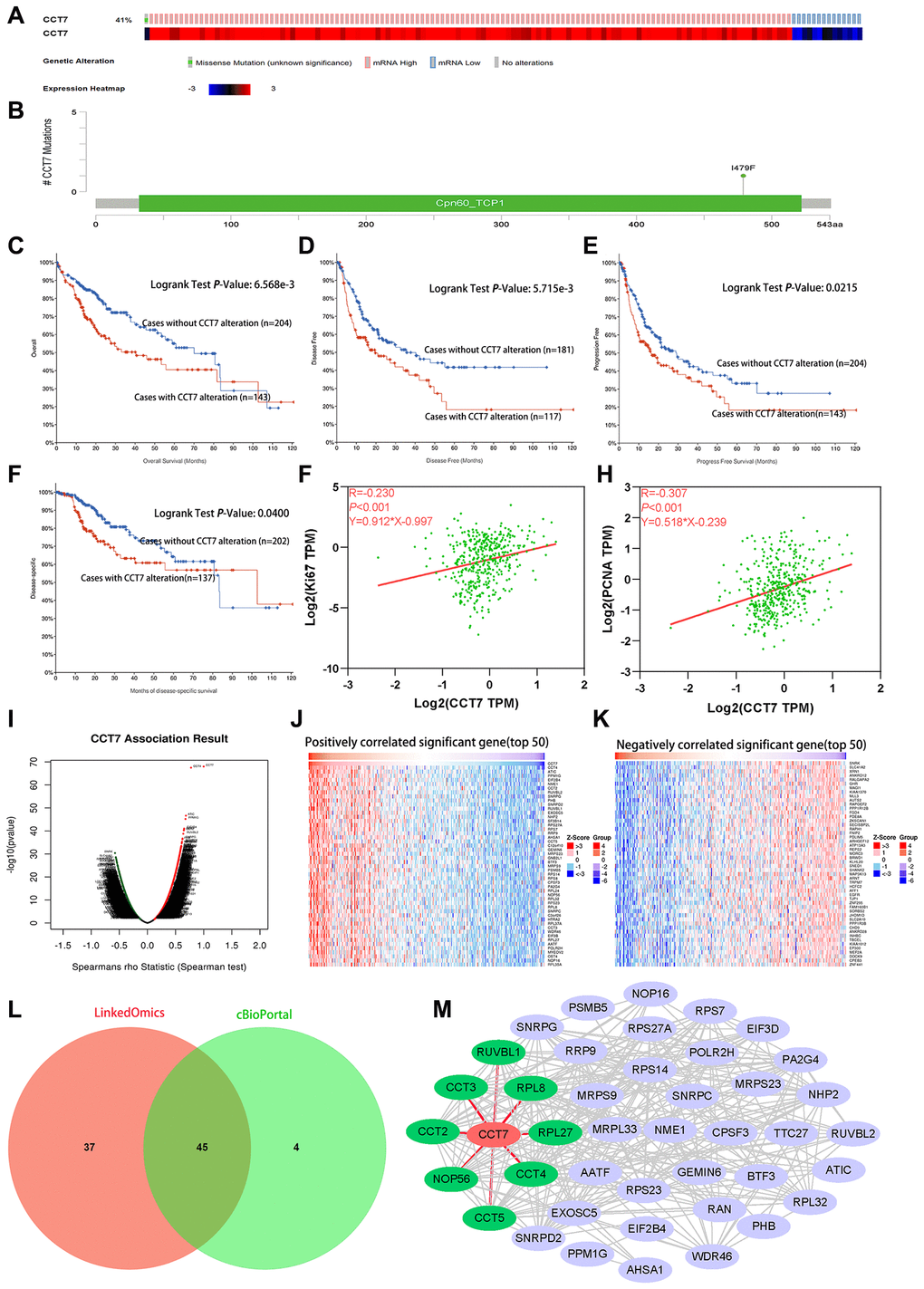 Figure 7. Genetic alterations of CCT7 are associated with poorer survival in HCC patients. (A) CCT7 was genetically altered in 143 patients (41%) from a cohort of 348 HCC patients. (B) A mutational hotspot of 1479F/Missense was found in 104 patients. (C–F) Survival analyses showing that HCC patients with CCT7 alterations had poorer OS (C), disease-free survival (D), progression-free survival (E) and disease-specific survival (F) than those without. (G, H) Spearman’s correlation analysis revealing that CCT7 mRNA expression correlated positively with Ki67 (G) and PCNA (H) expression. (I–K) CCT7 expression-associated target gene analysis in the LinkedOmics database. (I) Volcano chart exhibiting genes with significant positive/negative correlations with CCT7 expression. (J) Top 50 genes that were positively associated with CCT7 expression. (K) Top 50 genes that were negatively associated with CCT7 expression. (L) Venn plot showing the overlapping genes from the LinkedOmics and cBioPortal databases with Spearman’s values greater than 0.55. (M) PPI network for 45 genes co-expressed with CCT7. CCT2, CCT3, CCT4, CCT5, NOP56, RPL8, RPL27 and RUVBL1 were found to interact with CCT7.