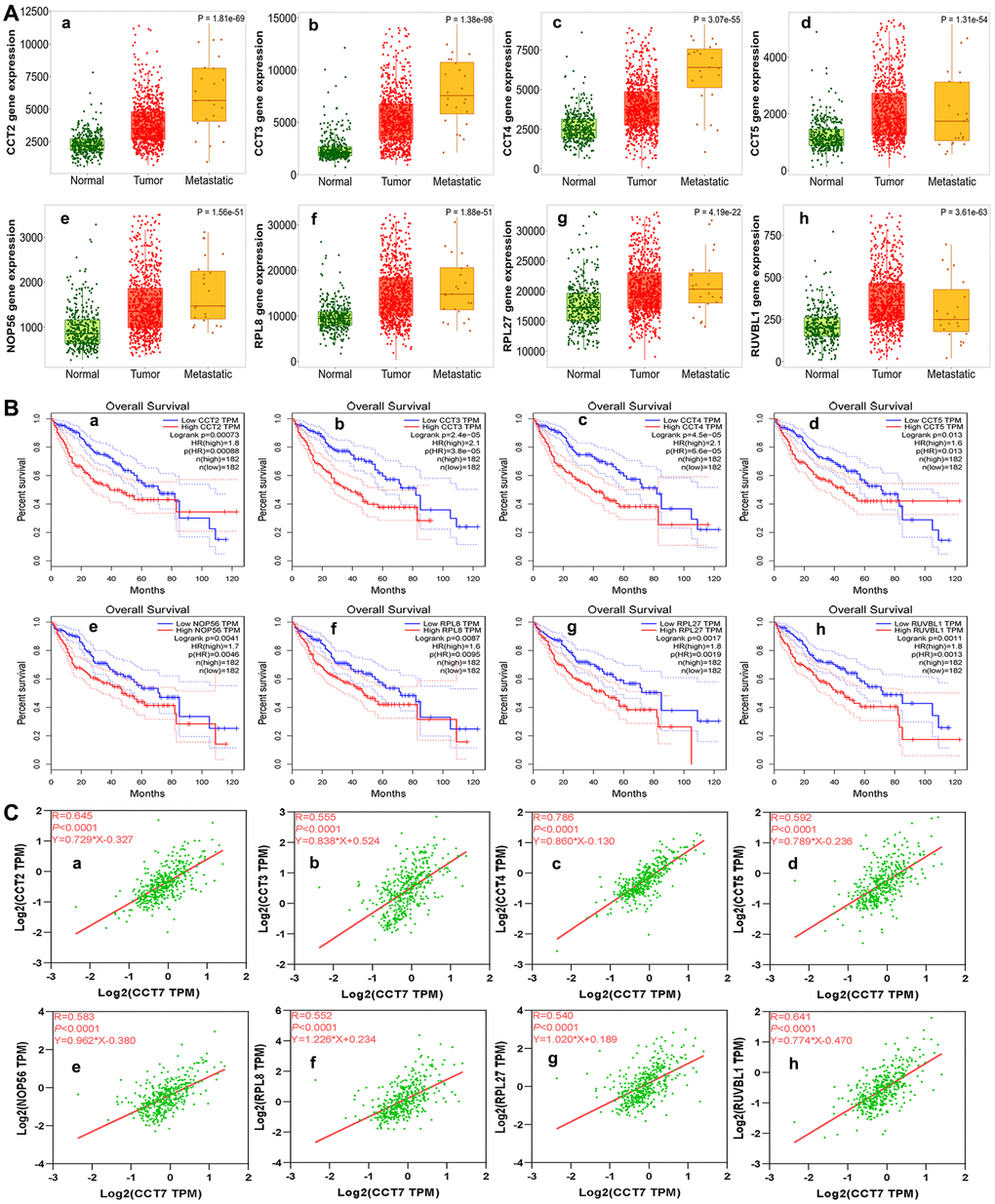 Figure 8. Analysis of genes co-expressed with CCT7 in HCC patients. (A) The mRNA levels of CCT2 (a), CCT3 (b), CCT4 (c), CCT5 (d), NOP56 (e), RPL8 (f), RPL27 (g) and RUVBL1 (h) in normal, tumor and metastatic tissues. (B) Survival analysis showing associations of CCT2 (a), CCT3 (b), CCT4 (c), CCT5 (d), NOP56 (e), RPL8 (f), RPL27 (g) and RUVBL1 (h) mRNA levels with the OS of HCC patients (all P < 0.05). (C) Correlation of CCT7 levels with CCT2 (a), CCT3 (b), CCT4 (c), CCT5 (d), NOP56 (e), RPL8 (f), RPL27 (g) and RUVBL1 (h) levels.