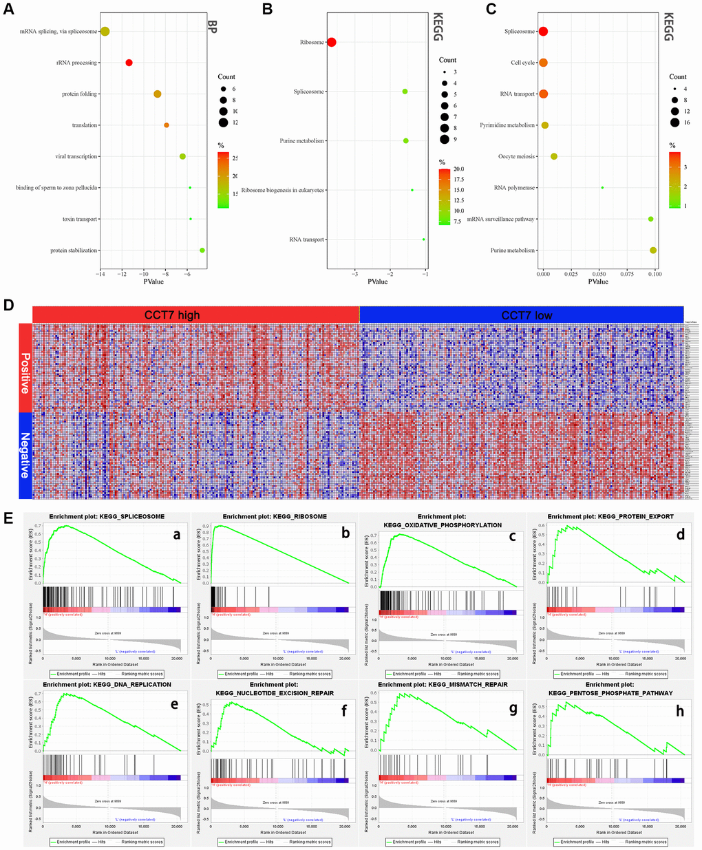 Figure 9. High CCT7 expression is associated with spliceosome gene expression in HCC patients. (A, B) The 45 genes co-expressed with CCT7 in HCC tissues, based on the GO Biological Process analysis (A) and KEGG pathway analysis (B). (C) The most significant survival-associated genes in HCC tissues, based on KEGG pathway analysis of data from the GEPIA database. (D) Heat map showing the median mRNA levels of genes co-expressed with CCT7 in HCC tissues in the GSEA. (E) The main enriched KEGG pathways of CCT7 based on GSEA. SPLICEOSOME (a), RIBOSOME (b), OXIDATIVE PHOSPHORYLATION (c), PROTEIN EXPORT (d), DNA REPLICATION (e), NUCLEOTIDE EXCISION PEPAIR (f), MISMATCH REPAIR (g), PENTOSE PHOSPHATE PATHWAY (h).