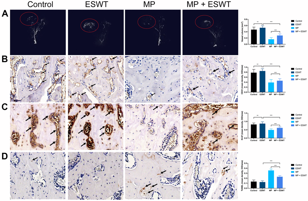 The effects of ESWT on cellular proliferation in the femoral heads of animal models were assessing using Ki67 immunostaining. The results revealed that cellular proliferation in the MP group was reduced compared to that in the control group. However, ESWT significantly reversed the steroid-induced anti-proliferative effect (Figure 1C). As shown in Figure 1D, the apoptosis rate was higher in the MP group than in the control group. Conversely, ESWT alleviated apoptosis in the femoral head. The aforementioned results suggest that ESWT enhances ECs proliferation and angiogenesis as well as alleviates apoptosis in steroid-induced ONFH.