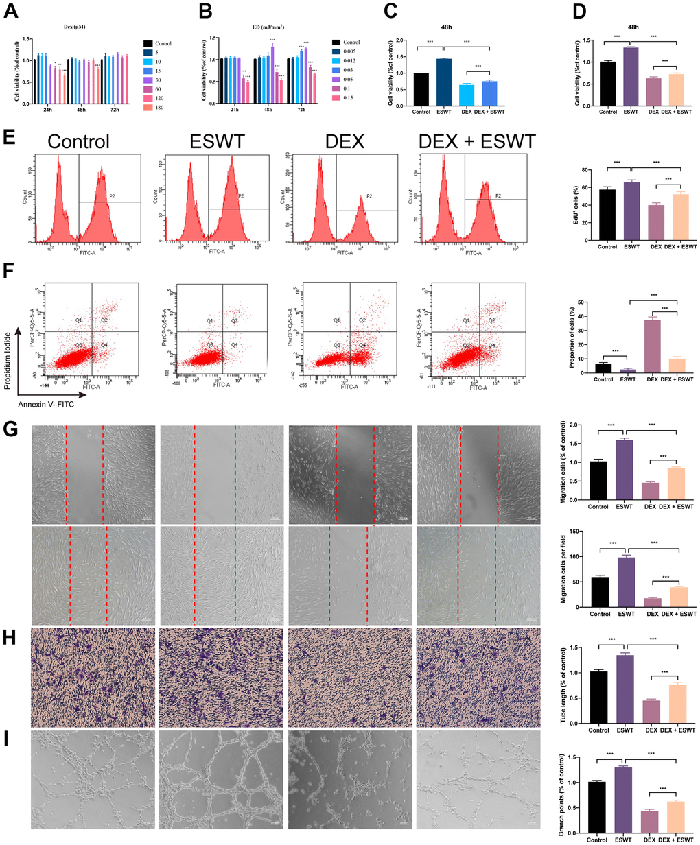 The DEX group showed strong anti-angiogenic effects in the tube formation assay with smaller tube length and loop formation, which was ameliorated by ESWT treatment. Furthermore, we observed that both types of ECs treated with ESWT alone presented superior angiogenesis activity compared to that of the control group (Figure 2I and Supplementary Figure 2).