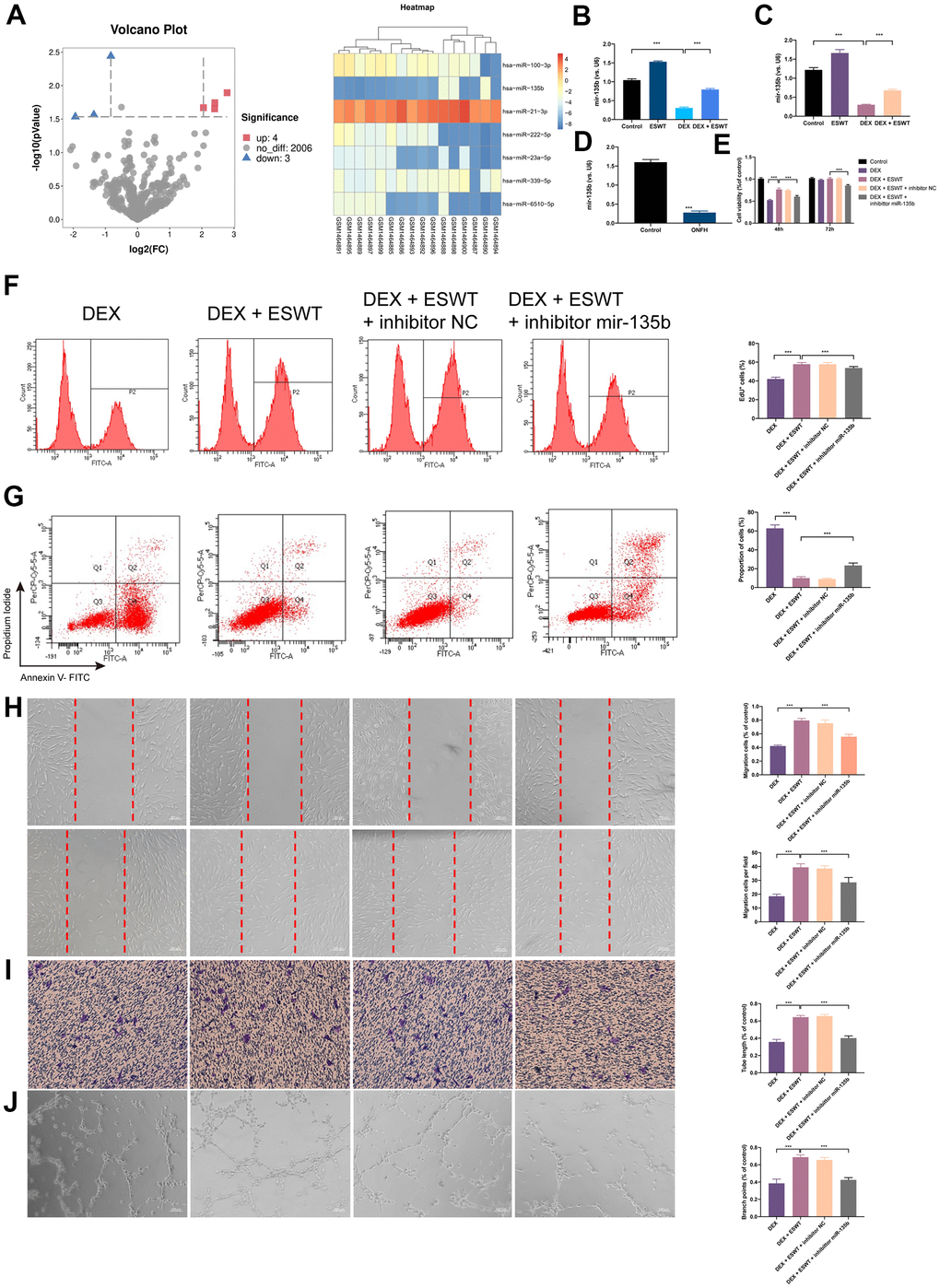 To identify the differentially expressed miRNAs (DEMs) that were regulated by GCs, miRNAs expression profiles of BMECs treated with GCs (GSE74089) were downloaded from the Gene Expression Omnibus database and analyzed. After normalization of the microarray results, DEMs were identified. As shown in the cluster heat map and volcano plot, a total of seven DEMs were observed in the dataset (Figure 3A). Among the DEMs, four were upregulated, whereas three were downregulated. Considering the most dramatically altered expression levels, we performed PCR assays to validate the miR-135b expression level changes in HUVECs, BMECs, and human necrotic femoral head tissues. The results showed that DEX downregulated miR-135b, whereas ESWT resulted in a significant increasement in the expression level of miR-135b (Figure 3B–3D).