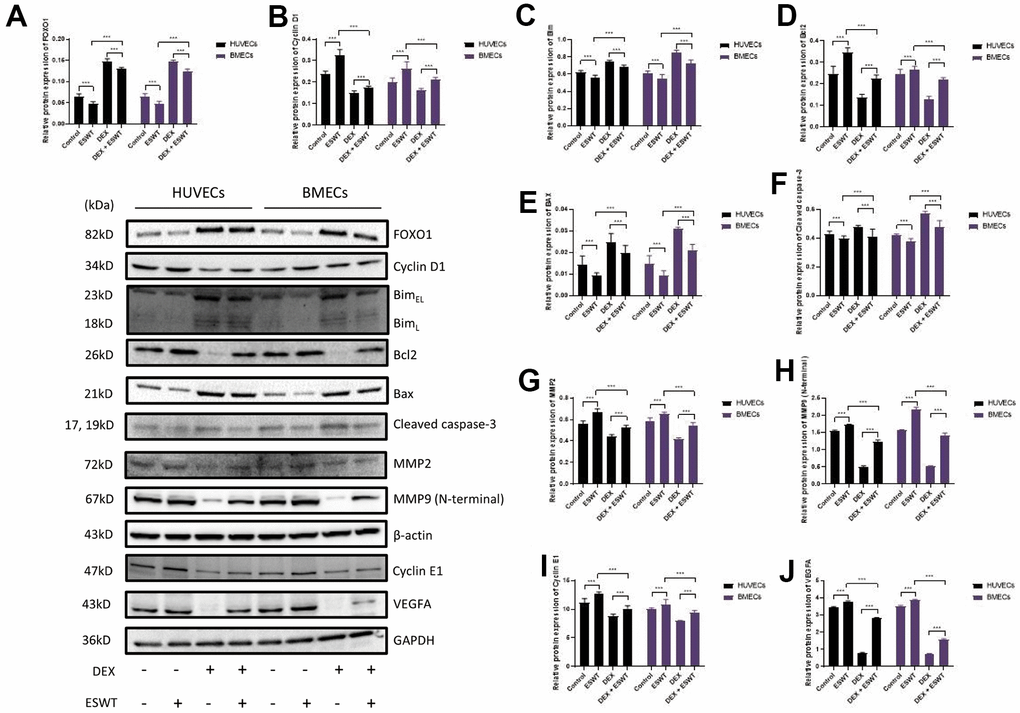 We used Annexin V-FITC/PI double staining with FC analysis to assess cell apoptosis. The results demonstrated that DEX dramatically increased the apoptosis rate in cells compared to that in the control group. Conversely, pretreatment with ESWT attenuated the apoptotic effect of DEX on HUVECs and BMECs. In addition, HUVECs and BMECs exposed to ESWT alone did not exhibit more apoptotic cells compared to those in the control group (Figure 2F and Supplementary Figure 2).