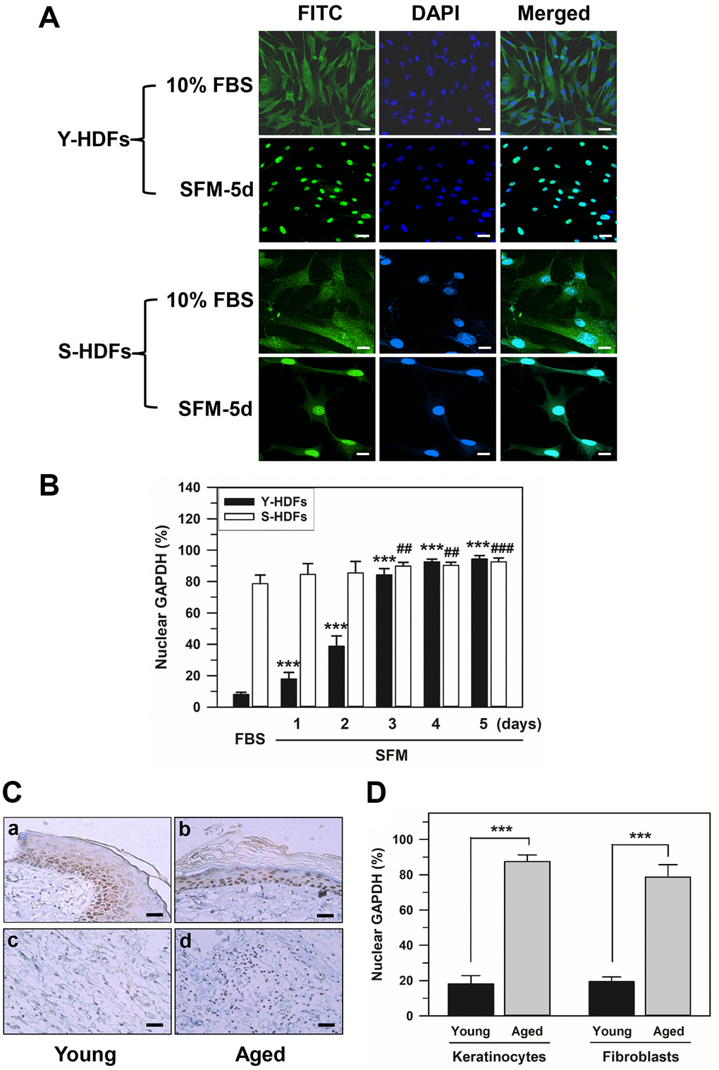 HDFs were isolated from the foreskin of neonates, as described previously [91]. HDFs were cultured in DMEM supplemented with 10% FBS, 100 U/mL penicillin, and 100 μg/mL streptomycin in 100 mm tissue culture dishes and were maintained in a humidified 5% CO2 incubator at 37°C. The cells were divided into three groups depending on the duration of growth: young, middle, and senescent. Young HDFs were cultured until PD was less than 25, middle HDFs until PD between 45 and 65, and senescent HDFs until PD greater than 65. Senescent HDFs were identified by their characteristic morphological changes, enhanced beta-galactosidase activity, and cell growth arrest. Before serum depletion, regardless of their classification, HDFs were grown for 2 days to reach 60–70% confluency in a culture medium containing 10% FBS. To determine the effect of serum or growth factor re-addition on the nuclear localization of GAPDH, subconfluent senescent HDFs were serum-deprived via a 5-day-incubation in SFM containing 0.1% bovine serum albumin (BSA).