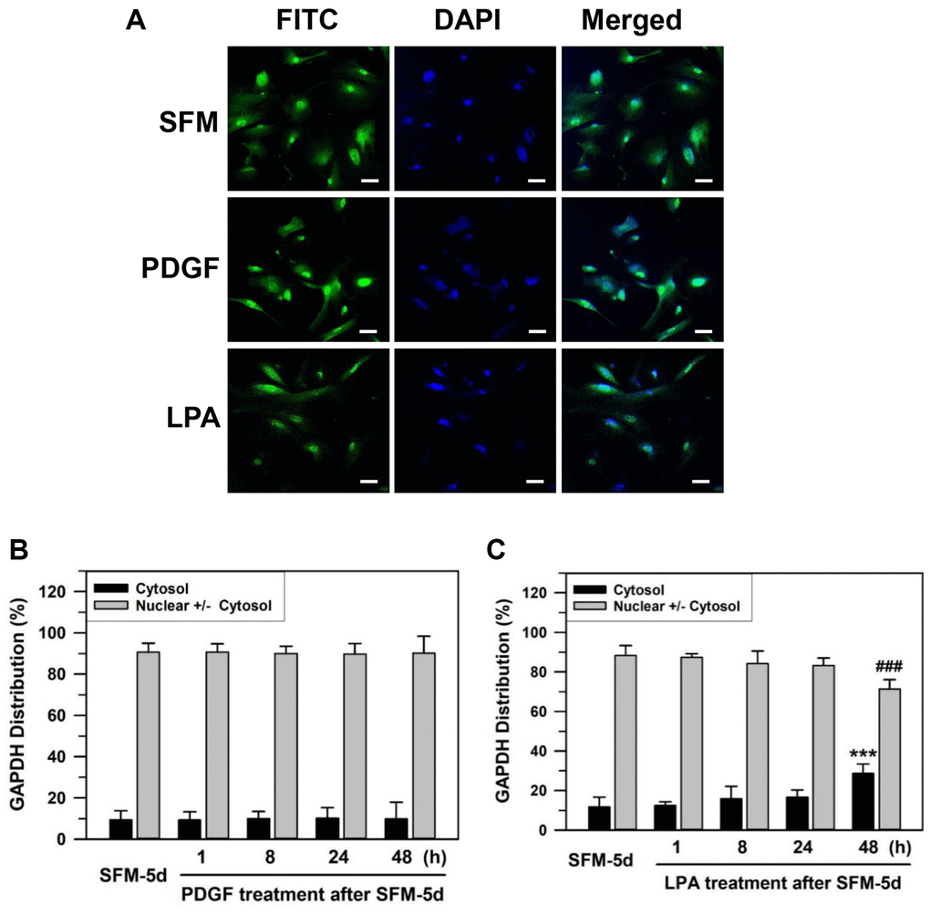 Previously, we have suggested that senescent cells respond to a naturally occurring phospholipid growth factor, lysophosphatidic acid (LPA), which works through G-protein coupled receptors, but not platelet-derived growth factor (PDGF), which works through a receptor tyrosine kinase [52]. To assess the change in GAPDH location upon growth factor re-addition to the media, the effects of LPA and PDGF were compared. Senescent HDFs were deprived of serum by culturing with SFM for 5 days and then grown further in 100 ng/mL PDGF or 30 μM LPA for 1–48 h (Figure 2). GAPDH in senescent HDFs was located mainly in the nucleus after serum deprivation for 5 days. A portion of nuclear GAPDH was exported to the cytoplasm upon LPA addition but not upon PDGF addition to the senescent HDFs (Figure 2A). The statistically significant difference between serum-depleted cells and PDGF- or LPA-treated cells for 1–48 h was determined by one-way ANOVA (F(4,35) = 17.543, p < 10–3) followed by Dunnett’s T3 post hoc test. The addition of PDGF yielded nuclear GAPDH dominant HDFs of 90.69% at 1 h, 90.05% at 8 h, 89.78% at 24 h, and 90.18% at 48 h with p-values greater than 0.05, which was not significant for all results when compared to the control SFM-treated for 5 days (90.60%) (Figure 2B). In contrast, LPA addition yielded nuclear GAPDH dominant HDFs of 87.47% at 1 h, 84.21% at 8 h, 83.35% at 24 h and 71.37% at 48 h (###p < 0.001) when compared to the control SFM-treated for 5 days (88.32%) (Figure 2C). These data suggest that LPA, but not PDGF, can induce the export of nuclear GAPDH in senescent HDFs.