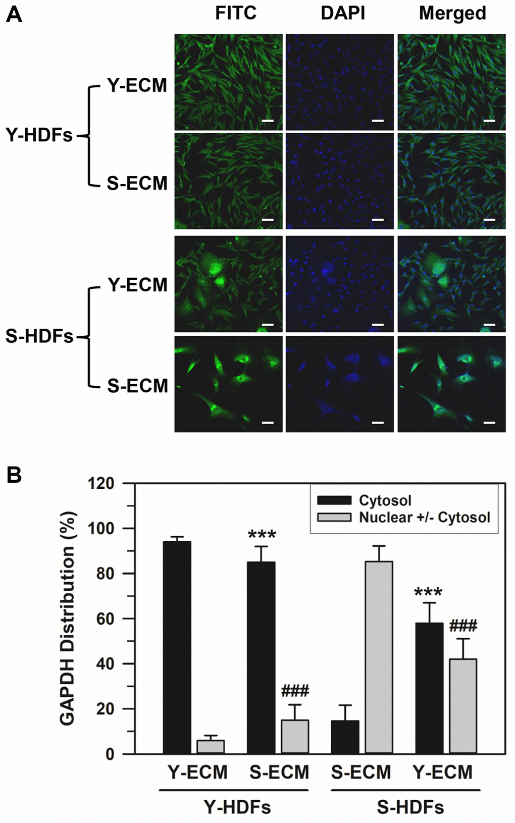To determine the effect of young and senescent ECM (Y-ECM and S-ECM, respectively) on the nuclear localization of GAPDH, subconfluent young (Y-HDFs, PD 16) and senescent HDFs (S-HDFs, PD 75) were seeded onto Y-ECM- or S-ECM-coated cover slides in 6-well plates and incubated in SFM for 5 days before immunofluorescence staining. Although the young HDFs did not show significant morphological changes in different ECMs, S-HDFs in Y-ECM showed morphological differences from the regular S-HDFs in S-ECM (Figure 3A). A portion of S-HDFs in Y-ECM showed young-like phenotype. The number of HDFs with cytosolic GAPDH alone and HDFs with nuclear GAPDH with or without cytosolic GAPDH were counted, and the percentage distributions are plotted in Figure 3B. Statistically significant differences between groups were determined by one-way ANOVA (F(3,68) = 499.517, p < 10–3) followed by Dunnett’s T3 post hoc test. As shown in Figure 3B, S-ECM reduced the cytosolic GAPDH levels in Y-HDFs from 94.03 to 85.06% (***p < 0.001), and Y-ECM increased those in S-HDFs from 14.68 to 57.98% (***p < 0.001). Similarly, S-ECM increased the nuclear GAPDH levels in Y-HDFs from 5.97 to 14.94% (###p < 0.001) and Y-ECM reduced those in S-HDFs from 85.32 to 42.02% (###p < 0.001). These data suggest that young ECM induces a young phenotype in a portion of senescent cells and consequently changes the distribution of GAPDH.