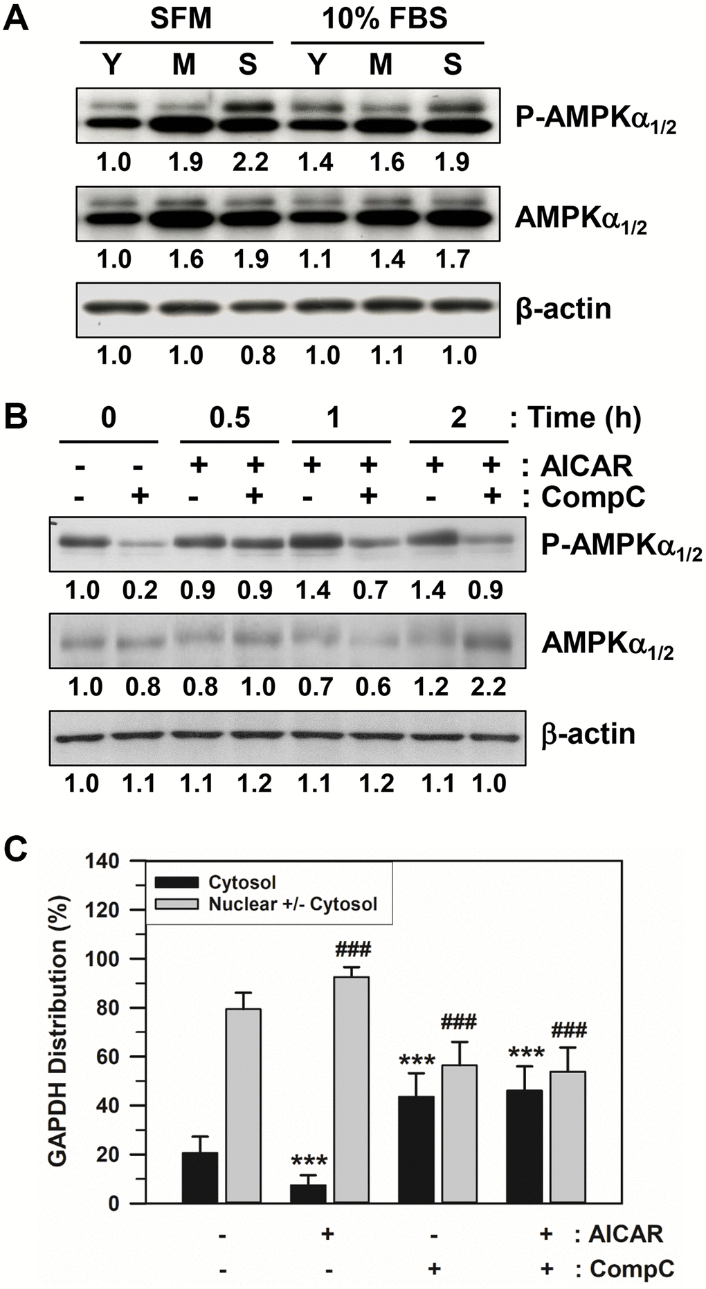 Numerous chemical reagents have been utilized in vivo and in vitro to modulate AMPK activity and AMPK-dependent cellular functions. The cell-permeable nucleoside 5-aminoimidazole-4-carboxamide-1- β-D-ribofuranoside (AICAR) is one of the most commonly used AMPK agonists. In contrast, the cell-permeable pyrazolopyrimidine derivative 6-[4-(2-Piperidin-1-yl-ethoxy)-phenyl]-3-pyridin-4-yl-pyrazolo [1,5-a] pyrimidine (Compound C: abbreviated to CompC) is a potent AMPK blocker via ATP-competitive inhibition. In this study, we used these AMPK activity modifiers. To determine the effects of AICAR and CompC on AMPK activation and GAPDH distribution, subconfluent senescent HDFs were serum-deprived for 2 days and were treated with vehicle, 1 mM AICAR. and/or 10 μM CompC for 2 days. Following treatment with AICAR and CompC, the cells were assessed by western blot analysis. The addition of AICAR to senescent HDFs increased AMPK activity, and the activation was negated by the addition of CompC (Figure 4B and Supplementary Figure 2).