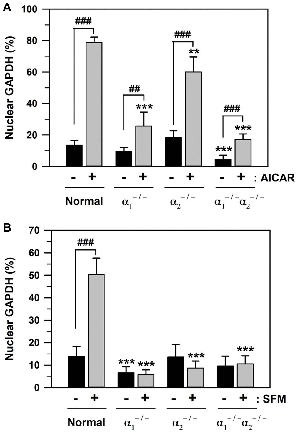 Using three types of AMPKα-knockout MEFs, AMPKα1 null (α1−/−), AMPKα2 null (α2−/−), and AMPKα1 and α2 null (α1−/−α2−/−), the effects of the catalytic α subunit of AMPK on GAPDH translocation were assessed. The baseline level of nuclear GAPDH and the level of its nuclear translocation upon addition of 1 mM AICAR or culturing in SFM for 48 h were compared in control MEFs and AMPKα-knockout MEFs. The statistically significant difference between groups was determined by one-way ANOVA (F(7,72) = 242.501, p < 10–3) followed by Dunnett’s T3 post hoc test. The control MEFs showed a significant increase in the level of nuclear GAPDH upon AICAR addition to 78.74% (5.84-fold increase), compared to the basal level of 13.49% (Figure 6A). Compared to the control MEFs, the baseline levels of nuclear GAPDH were reduced to 9.53 and 4.63% (***p < 0.001) in AMPKα1−/− and AMPKα1−/−/α2−/− MEFs, respectively. The rates of nuclear GAPDH upon AICAR addition significantly (###p < 0.001) decreased to 25.65, 60.06, and 17.15% in AMPKα1−/−, AMPKα2−/−, and AMPKα1−/−/α2−/− MEFs, respectively, compared to 78.74% in control MEFs. These data indicate the critical role of AMPKα1 and the partial role of AMPKα2 in the nuclear translocation of GAPDH in MEFs.