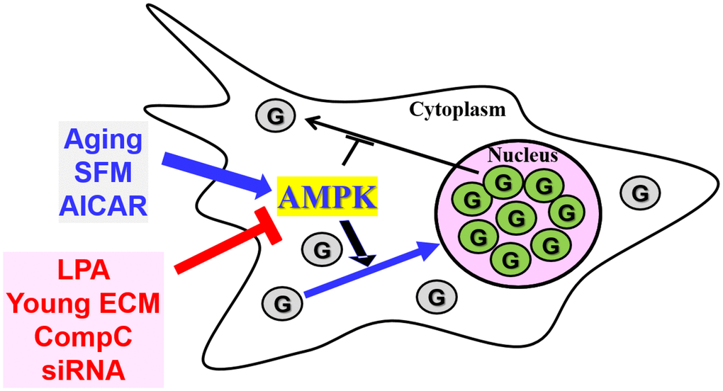 Taken together, our results, summarized in Figure 7, suggest that the nuclear accumulation of GAPDH might be due to enhanced AMPK activity in senescent HDFs, which could possibly be reversed with proper modification of AMPK activity.