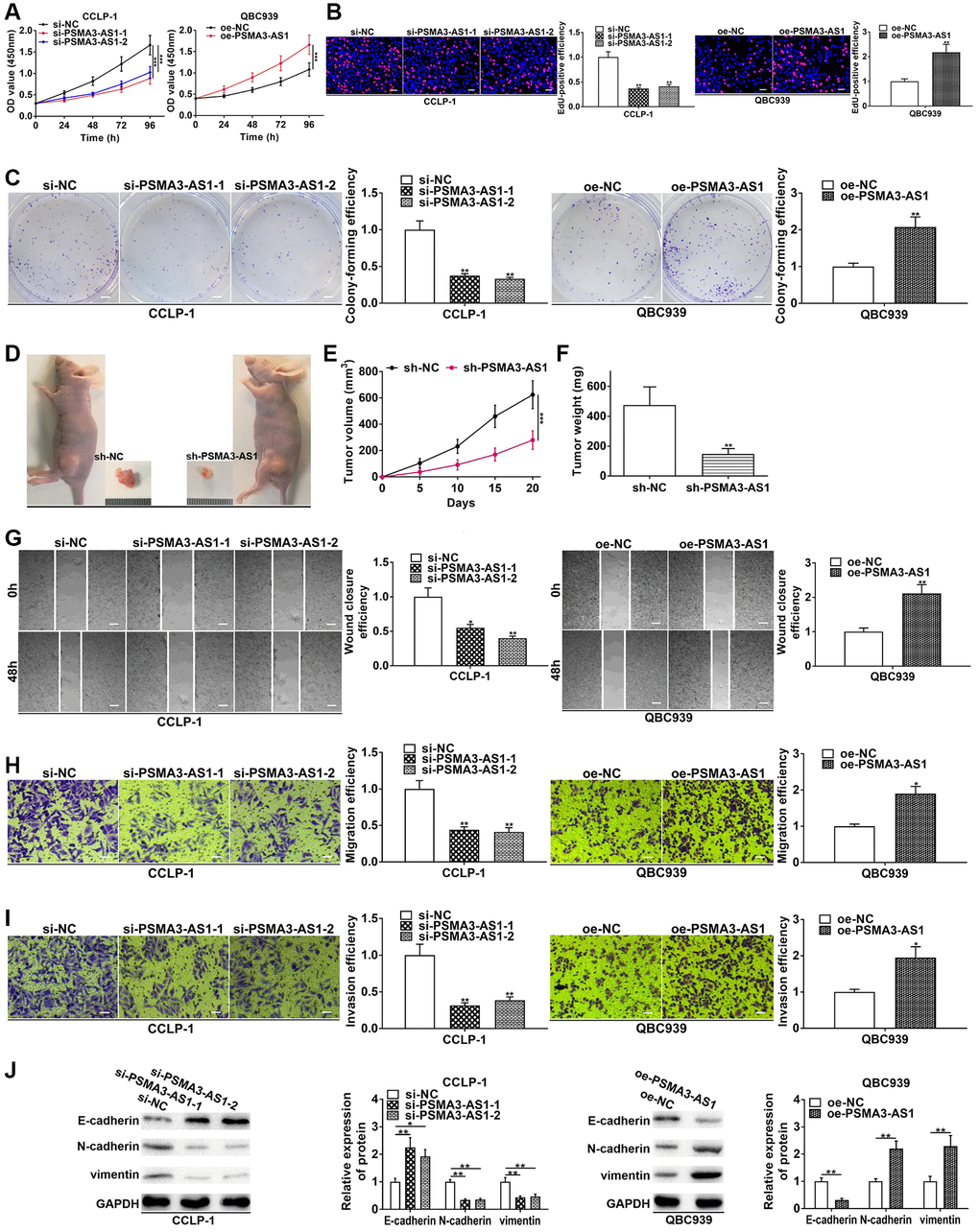In the light of PSMA3-AS1 expression analysis in the four cholangiocarcinoma cells, PSMA3-AS1 level was the highest in CCLP-1 and the lowest in QBC939 cells. Therefore, to obtain a more logical experimental result, we chose to knock down PSMA3-AS1 in CCLP-1 to execute loss-of-function assays, and chose to overexpress it in QBC939 to perform gain-of-function assays. Proliferation experiments confirmed that silencing PSMA3-AS1 depressed cellular vitality, whereas elevating PSMA3-AS1 enhanced cellular vitality (Figure 2A, 2B). Colony formation assay corroborated that PSMA3-AS1 facilitated the colony-forming ability of cholangiocarcinoma cells (Figure 2C). To examine effect of PSMA3-AS1 on CCA proliferation in vivo, we established subcutaneous tumor xenograft model (n = 6 per group). Silencing PSMA3-AS1 significantly inhibited tumor growth compared with negative control groups (Figure 2D), including the volume (Figure 2E) and weight (Figure 2F) of the tumors. Whereafter, silencing PSMA3-AS1 depressed cholangiocarcinoma migration, whereas elevating PSMA3-AS1 boosted cell migration (Figure 2G, 2H). Transwell invasion assay pre-coated with Matrigel further uncovered that PSMA3-AS1 facilitated CCA cell invasion in comparison with control groups (Figure 2I). Vimentin and N-cadherin represented EMT-related mesenchymal markers, and E-cadherin represented EMT-related epithelial marker. As shown in Figure 2J, knocking down PSMA3-AS1 significantly inhibited vimentin and N-cadherin, but facilitated E-cadherin in CCLP-1. On the contrary, overexpressed PSMA3-AS1 promoted vimentin and N-cadherin expression, whereas depressed E-cadherin in QBC939 cells. Thus, PSMA3-AS1 accelerated the EMT process of CCA. The above functional experiments suggest that PSMA3-AS1 boosts growth and metastasis of cholangiocarcinoma.