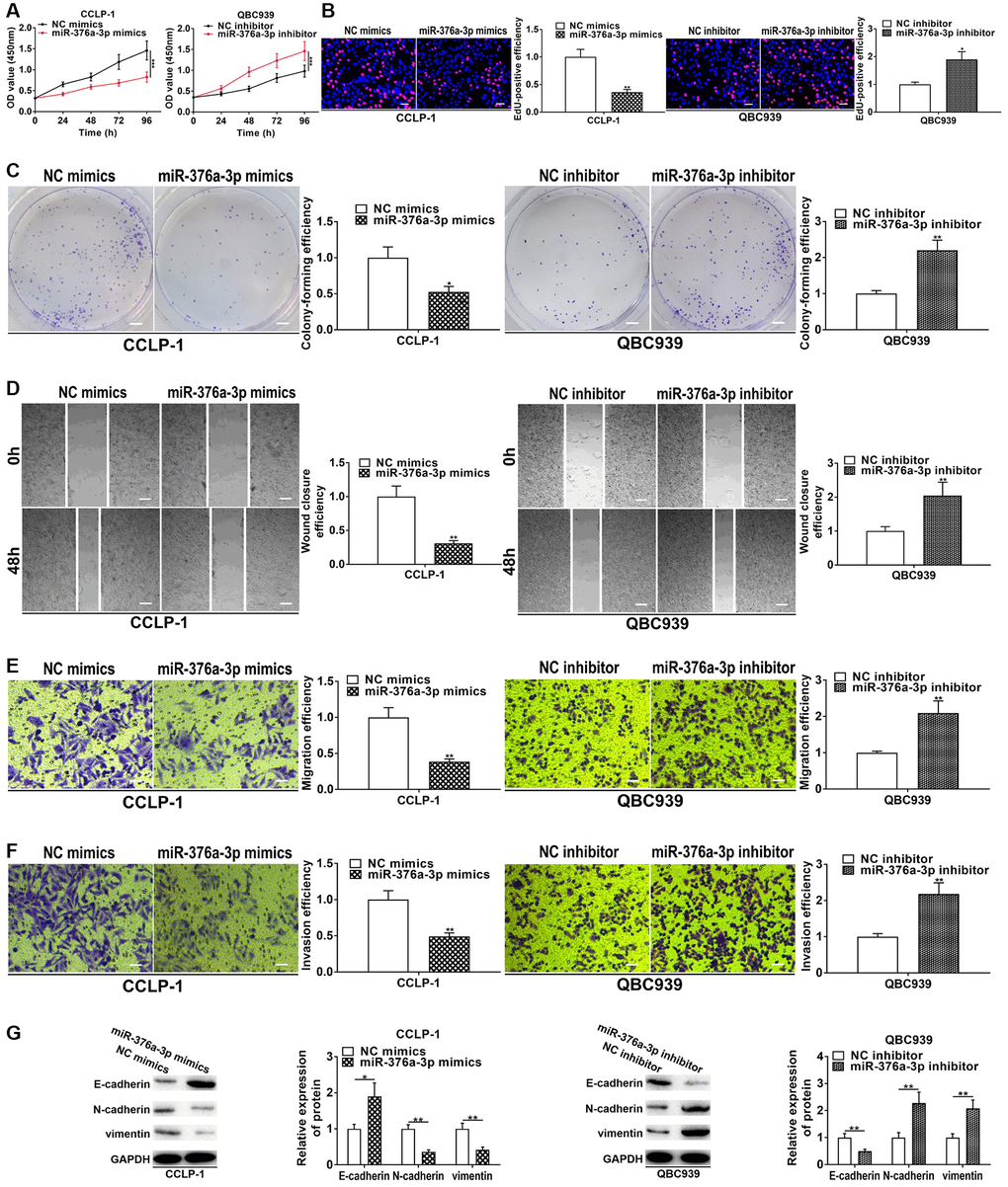 PSMA3-AS1 was predominantly expressed in CCA cytoplasm (Figure 4A), so we predicted its downstream target genes functioning through ceRNA patterns at the post-transcriptional level via StarBase database. By examining effects of knockdown and overexpression of PSMA3-AS1 on the target miRNAs, we found that knocking down PSMA3-AS1 significantly increased miR-376a-3p level, but overexpressing PSMA3-AS1 significantly decreased miR-376a-3p (Figure 4B). MiR-376a-3p expression was downregulated in CCA tissues (Figure 4C), and negatively related to PSMA3-AS1 expression (r = −0.4969, P < 0.001, Figure 4D). MiR-376a-3p was also downregulated in cholangiocarcinoma cells (Figure 4E). The knockdown efficiency and overexpression efficiency of miR-376a-3p inhibitor and mimics were shown in Figure 4F. Elevating miR-376a-3p only repressed luciferase activity of PSMA3-AS1 wild type (Figure 4G, 4H). AGO2 RNA immunoprecipitation (RIP) demonstrated that PSMA3-AS1 directly adsorbed miR-376a-3p (Figure 4I). Besides, overexpressing miR-376a-3p depressed growth and metastasis of cholangiocarcinoma, but knocking down miR-376a-3p promoted these malignant biological behaviors (Figure 5). The above results indicate that PSMA3-AS1 adsorbs miR-376a-3p to accelerate CCA deterioration.
