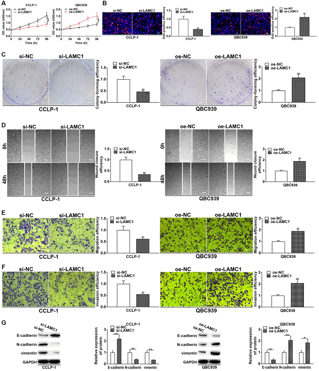 StarBase v3.0 database showed that PSMA3-AS1 had overlapping binding sites with LAMC1 at miR-376a-3p sequences (Supplementary Figure 1D). Hence, we determined to validate regulatory relationship of miR-376a-3p and LAMC1. As shown in Figure 6A and 6B, si-LAMC1 significantly inhibited LAMC1 expression, while pcDNA3.1-LAMC1 significantly enhanced LAMC1. Furthermore, miR-376a-3p mimics decreased LAMC1 expression and miR-376a-3p inhibitor increased LAMC1 level in CCA cells (Figure 6C, 6D). Moreover, silencing PAX5 restrained LAMC1 expression and overexpressing PAX5 facilitated LAMC1 expression (Supplementary Figure 1E). TCGA displayed that LAMC1 was upregulated in cholangiocarcinoma (Figure 6E). Authentically, LAMC1 was overexpressed in CCA tissues (Figure 6F, 6G), and negatively related to miR-376a-3p (r = −0.4561, P < 0.001, Figure 6H). Nevertheless, LAMC1 was positively related to PAX5 (r = 0.4457, P < 0.001, Supplementary Figure 1F). LAMC1 was also elevated in cholangiocarcinoma cells (Figure 6I, 6J). We implemented luciferase reporter assay and RIP assay to demonstrate complementary binding of miR-376a-3p and LAMC1. Wild and mutant type of LAMC1 3′UTR were constructed into luciferase plasmids, respectively (Figure 6K). Elevating miR-376a-3p reduced the luciferase activity of LAMC1 wild type rather than mutant (Figure 6L). Furthermore, RIP uncovered that LAMC1 was augmented via anti-AGO2 antibody with miR-376a-3p mimics (Figure 6M). Above findings illustrate that miR-376a-3p directly binds to LAMC1 and restrains its expression in CCA cells. Besides, we detected influence of LAMC1 on malignant biological behaviors of cholangiocarcinoma, and corroborated that downregulated LAMC1 repressed cellular growth and metastasis, whereas upregulated LAMC1 facilitated these malignant biological behaviors (Figure 7).