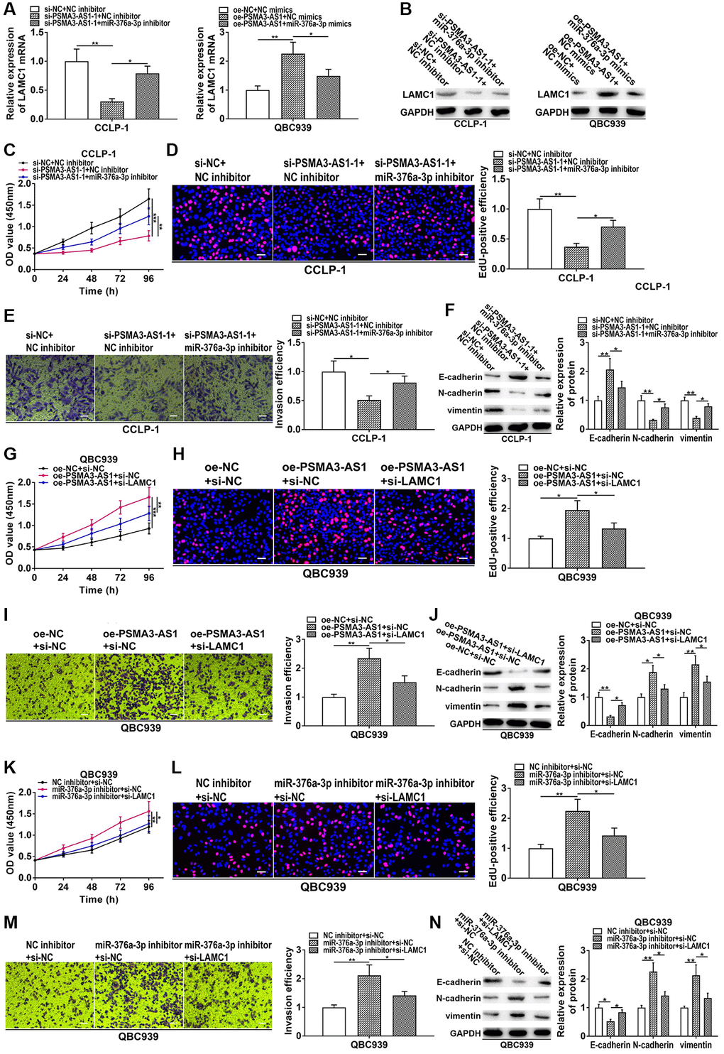To further confirm that PSMA3-AS1 regulated miR-376a-3p/LAMC1 to boost CCA development, we performed rescue experiments. As presented in Figure 8A and 8B, silencing PSMA3-AS1 inhibited LAMC1 expression in CCA cells, but reducing miR-376a-3p rescued this process. On the contrary, overexpression of PSMA3-AS1 promoted LAMC1 expression, whereas co-transfection of miR-376a-3p mimics could save promoting influence caused by PSMA3-AS1 overexpression. In CCK-8 and EdU experiments, knocking down miR-376a-3p could reverse the proliferative inhibition generated via silencing PSMA3-AS1 (Figure 8C, 8D). In transwell and EMT assays, restoration of miR-376a-3p rescued suppression of metastasis and EMT induced via silencing PSMA3-AS1 (Figure 8E, 8F). Moreover, downregulated LAMC1 could rescue facilitation of growth, metastasis and EMT induced by PSMA3-AS1 overexpression (Figure 8G–8J). In addition, knocking down miR-376a-3p boosted cellular malignant process, nevertheless, the boosting influence was weakened via silencing LAMC1 (Figure 8K–8N). These results suggest that PSMA3-AS1 boosts cholangiocarcinoma proliferation and metastasis by modulating miR-376a-3p/LAMC1.
