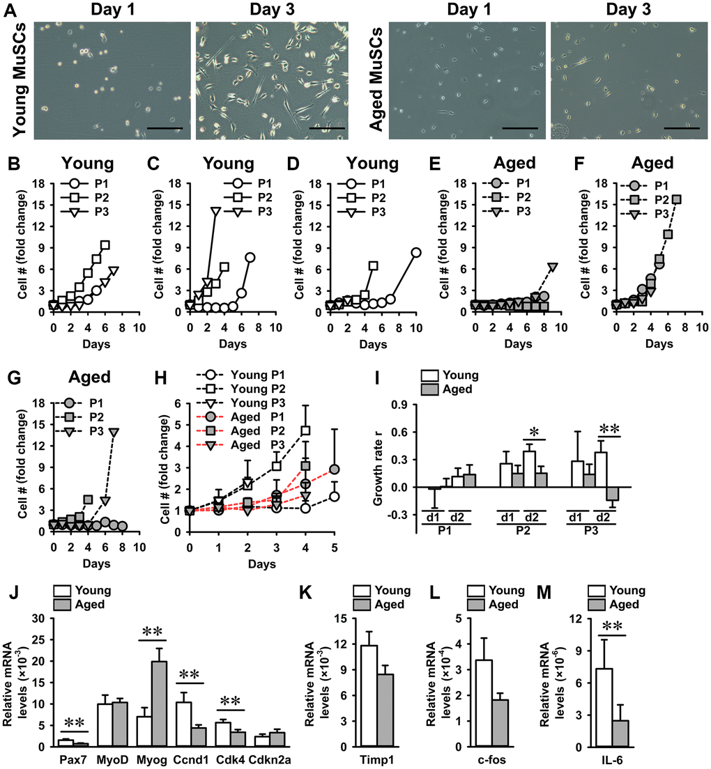 Exponential growth rates of MuSCs isolated from young mice (young MuSCs) and aged MuSCs were determined to assess whether aged MuSCs were intrinsically impaired in their ability to proliferate. Young and aged MuSCs were cultured under standard culture conditions to expand the cell number and determine cell growth rates (Figure 1A). Individual growth curves of young and aged MuSCs over three passages were assessed (Figure 1B–1G). The P1 of young and aged MuSCs did not show difference in fold-change in cell number (Figure 1H). During subsequent passages (P2, or P3), no significant difference was found in fold-change in cell number over the initial cell number seeded, for young (2–5-fold) and aged (2–3-fold) MuSCs due to large coefficient of variation (Figure 1H). The average exponential growth rate of MuSCs from three passages (P1-P3) during the first two days of culture was determined. Since the young MuSCs reached confluence at day 2–3, the growth rate could not be determined at later time points. The growth rate of young MuSCs was 23% per day, while that of aged MuSCs was only 7% per day (Figure 1I).
