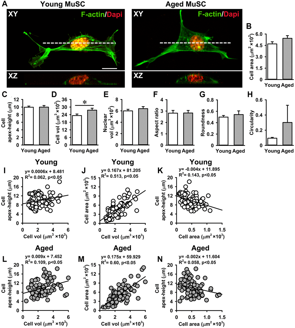 We tested whether MuSCs with a larger volume were more spread (i.e. flat) or round-shaped than MuSCs with a smaller volume by plotting the relation between cell apex-height, cell volume, and cell area. A slight positive relation between cell apex-height and cell volume was shown by both young (R2 = 0.06) and aged MuSCs (R2 = 0.10; Figure 2I, 2L). A strong positive correlation between cell area and cell volume was shown by both young (R2 = 0.51) and aged MuSCs (R2 = 0.60), indicating that MuSCs with a large cell volume spread more than MuSCs with a small volume in vitro (Figure 2J, 2M). In contrast, the relation between MuSC apex-height and cell area was negative in both young (R2 = 0.14) and aged MuSCs (R2 = 0.05; Figure 2K, 2N).