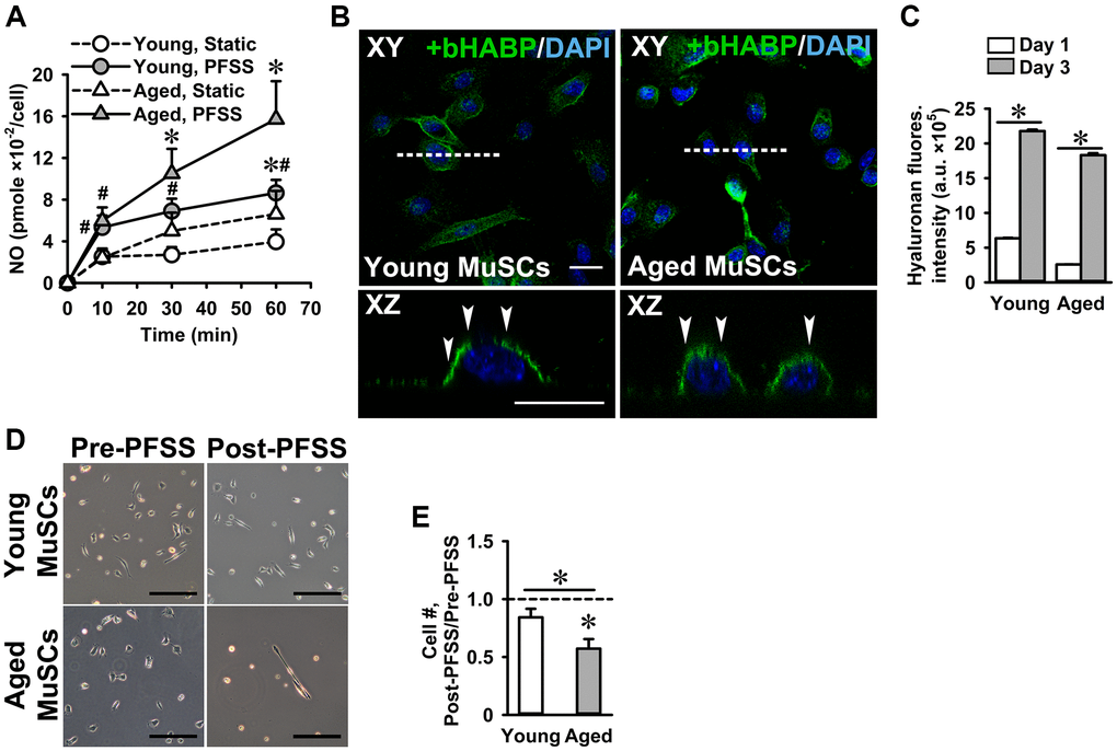 We have shown previously that C2C12 myotubes and osteocytes respond to pulsating fluid shear stress (PFSS)-induced mechanical loading by increased NO production [20, 49]. Here we investigated whether MuSCs also respond to mechanical loading by PFSS, and whether there is a difference in the response of young and aged MuSCs. PFSS stimulated NO production in young and aged MuSCs, while aged MuSCs showed a slightly higher (not significant) response compared to young MuSCs (Figure 3A). Ten minutes of PFSS increased NO production in young MuSCs by 2.1-fold and in aged MuSCs by 2.4-fold, after which the NO production did not further increase during 1 h PFSS treatment (Figure 3A). Earlier we have shown that NO production in C2C12 myotubes requires an intact glycocalyx [20]. Here we questioned whether primary MuSCs also have a glycocalyx, and whether this glycocalyx changes with age. We showed that both young and aged MuSCs expressed a glycocalyx (Figure 3B). Quantification of hyaluronic acid fluorescence intensity (a glycocalyx component) showed that glycocalyx expression increased by 3.5-fold in young MuSCs, and by 7.0-fold in aged MuSCs after three days of culture (Figure 3C). No significant difference was found in glycocalyx expression between young and aged MuSCs (Figure 3C). As cell shape and strength of attachment are related, i.e. well adhered and spread cells are likely to be more firmly attached than spherical cells [50], we also determined the strength of cell attachment by measuring the number of cells that detached from the substrate as a result of exposure to a shear force treatment. Fifteen percent of the young MuSCs detached during 1 h PFSS application, whereas 43% aged MuSCs were removed by PFSS (Figure 3D, 3E).