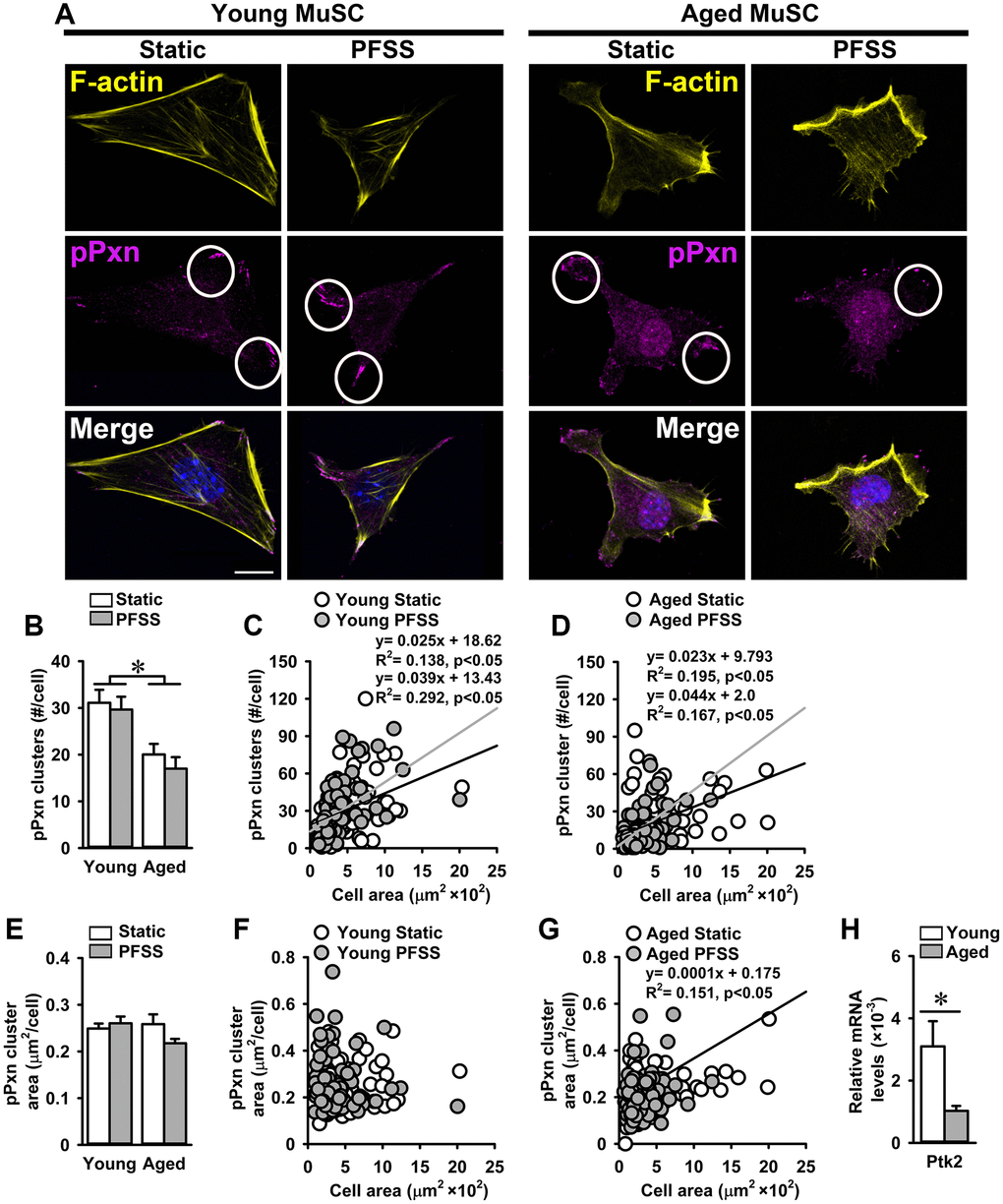 Since a large number of aged MuSCs detached when exposed to PFSS, we investigated whether this was due to altered focal adhesion number and/or size, and whether MuSCs change focal adhesion number and/or size when subjected to mechanical loading. Therefore, young and aged MuSCs were stained for pPXN, and the number and size of focal adhesions was determined in PFSS-treated and untreated control cells. As expected, the number of pPXN clusters (focal adhesions) in aged MuSCs was 39% lower compared to that in young cells, while PFSS-treatment did not affect pPXN cluster number in young and aged MuSCs (Figure 4A, 4B). Furthermore, we assessed whether the number of pPXN clusters was related to cell attachment area. A positive relation between the number of pPXN clusters and cell area was shown for both young and aged MuSCs (young MuSCs, static: R2 = 0.13; PFSS: R2 = 0.29; (Figure 4C); aged MuSCs, static: R2 = 0.19; PFSS: R2 = 0.16; (Figure 4D)).
