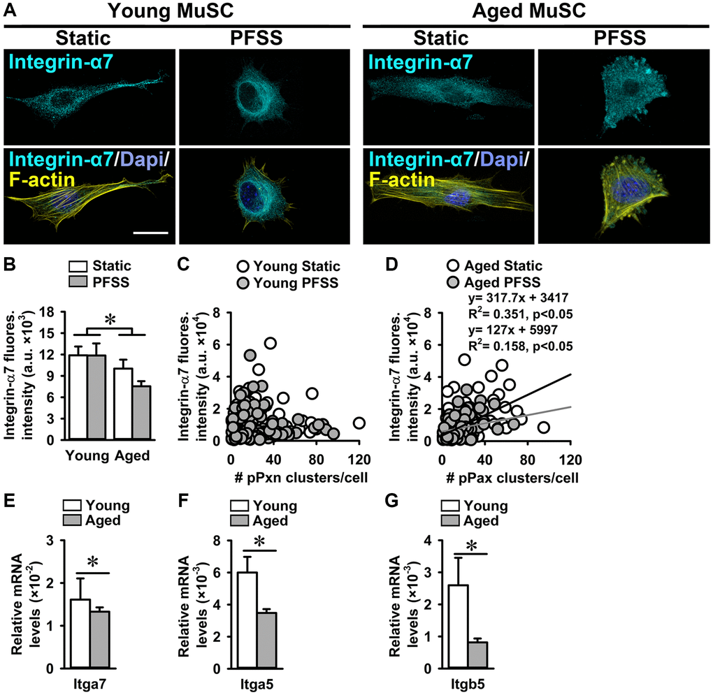 A possible relationship between ITGA7 fluorescence intensity and the number of pPXN clusters was assessed in young and aged static control and PFSS-treated MuSCs. We did not observe a relation between ITGA7 fluorescence intensity and the number of pPXN clusters in young MuSCs (Figure 5C). Interestingly, a group of young MuSCs showed a very high ITGA7 expression and low pPXN cluster number, while the other group had a very low ITGA7 expression and high pPXN cluster number (Figure 5C). In contrast, aged MuSCs showed a significant correlation between ITGA7 expression and pPXN cluster number in static control (R2 = 0.35) and PFSS-treated cultures (R2 = 0.35; Figure 5D). In line with the decreased ITGA7 fluorescent levels, Itga7 gene expression was 17% lower in aged MuSCs compared to young MuSCs (Figure 5E). We quantified Itga5 and Itgb5 gene expression in young and aged MuSCs, and found decreased Itga5 (42%) and Itgb5 (68%) gene expression in aged MuSCs (Figure 5F, 5G).