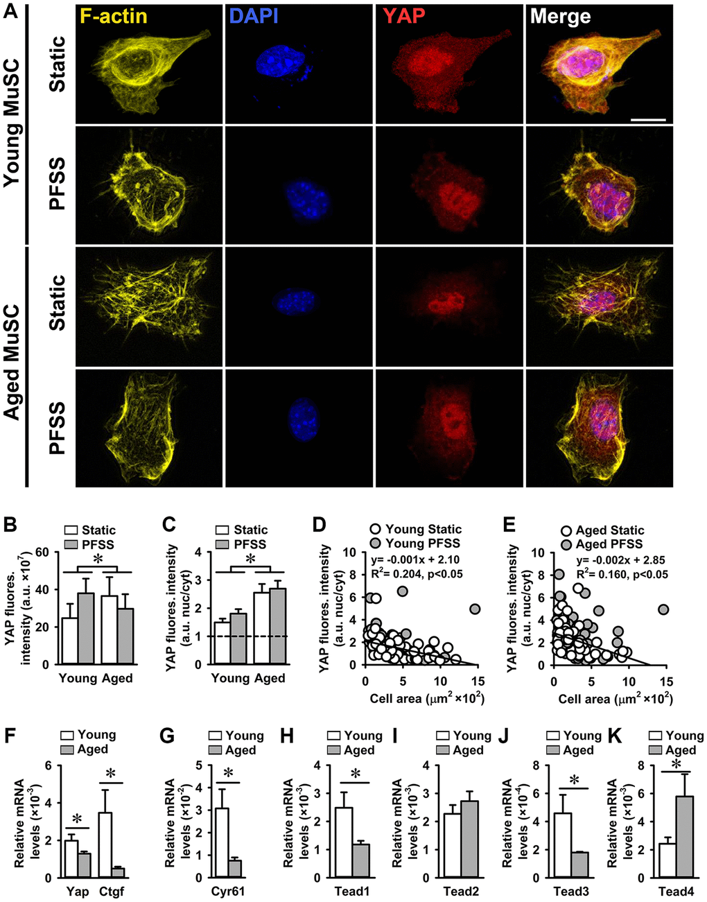 The reduced growth rate of aged MuSCs and their detachment due to PFSS-treatment, together with the lower number of focal adhesions and decreased ITGA7 levels compared to young MuSCs, suggest an impaired downstream signaling of ITGA7 receptors. Cells sense the mechanical properties of their niche via focal adhesions, which connect the outside environment to the cell cytoskeleton [52]. In mechanosensing, the hippo pathway and its effectors YAP and transcription regulator protein 1 (TAZ), which are transcription co-factors, play an important role by shuttling into the nucleus and induce upregulation of gene expression by binding to transcription factors. They determine MuSC fate and affect muscle regeneration [53]. YAP nuclearization is important in focal adhesion-related gene expression, and YAP knockout in a mesenchymal cell line disrupts focal adhesion formation and alters the actin cytoskeleton [38]. Here we investigated YAP nuclear localization in young and aged static control and PFSS-treated MuSCs.