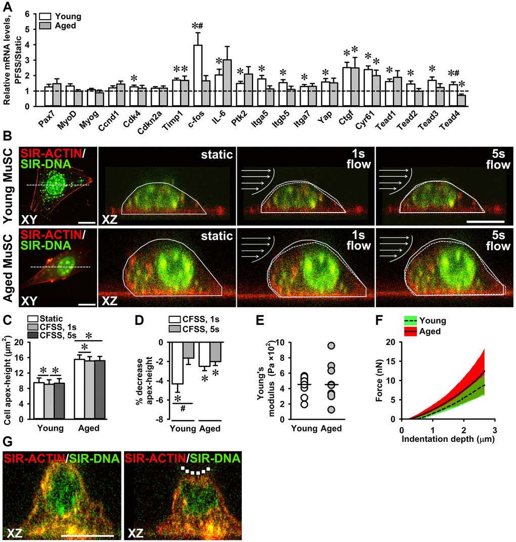 To investigate whether PFSS-treatment induced expression of genes related to proliferation, focal adhesion, and YAP signaling, and whether mechanoresponsiveness was compromised with age, gene expression in static control and PFSS-treated young and aged MuSCs was determined. PFSS upregulated gene expression of Cdk4 (27%), Timp1 (71%), c-fos (296%), IL-6 (104%), Ptk2 (49%), Itga5 (78%), Itgb5 (54%), Itga7 (29%), Yap (58%), Ctgf (151%), Cyr61 (139%), Tead1 (60%), Tead2 (45%), Tead3 (69%), and Tead4 (41%) in young MuSCs (Figure 7A). In aged MuSCs, PFSS only upregulated gene expression of Timp1 (68%), Ctgf (149%), and Cyr61 (99%; Figure 7A). Tead4 gene expression was reduced by 29% after PFSS treatment in aged MuSCs (Figure 7A). The coefficient of variation for PFSS-induced gene expression was higher in aged MuSCs i.e. Pax7 (61%), Myog (57%), Cdk4 (43%), Cdkn2a (35%), Timp1 (48%), IL-6 (81%), Ptk2 (65%), Itgb5 (54%), Itga7 (40%), Yap (56%), Ctgf (77%), Cyr61 (51%), Tead1 (64%), and Tead3 (57%). Whereas young MuSCs exhibited a lower coefficient of variation for these genes i.e. Pax7 (43%), Myog (24%), Cdk4 (28%), Cdkn2a (26%), Timp1 (22%), IL-6 (55%), Ptk2 (28%), Itgb5 (39%), Itga7 (31%), Yap (45%), Ctgf (44%), Cyr61 (32%), Tead1 (31%), and Tead3 (39%). The response to loading has been linked to cell shape, as explored above, but also to cell stiffness [54, 55]. To explore whether aged MuSCs exhibited an altered cell stiffness, live cell imaging of MuSCs subjected to a constant fluid shear stress (CFSS) was performed and cell deformation was quantified. We showed that young and aged MuSCs deform in response to shear stress (Figure 7B). At the start of shear stress treatment (at 1 sec CFSS), cell apex-height was reduced in young MuSCs by 4.3%, and in aged MuSCs by 2.5%. After 5 sec CFSS application, young MuSCs almost regained their initial apex-height, but aged MuSCs remained deformed (Figure 7C, 7D). We then determined the Young’s moduli of MuSCs by indentation of MuSCs using a nano-indenter with spherical tip (diameter: 7 μm). Our results revealed a similar Young’s modulus (~450 Pa) of young and aged MuSCs, but aged MuSCs exhibited a substantially larger coefficient of variation (61%) compared to that of young MuSCs (27%; Figure 7E–7G). As evident from the force-indentation curves of MuSCs, large variation in the indentation force was observed for aged MuSCs (Figure 7F).