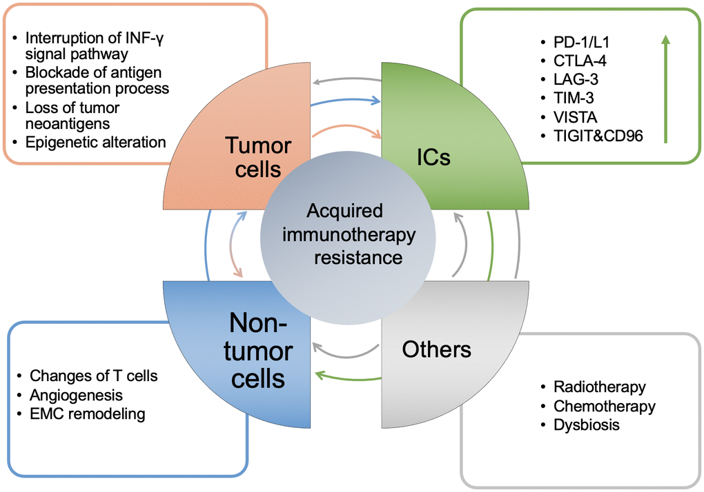 Acquired resistance of ICIs is a disadvantage encountered in patients who were initially showing effective response to treatment. Therefore, it is important to distinguish certain patients with the poor response for ICIs, including those who exhibit primary resistance, acquired resistance, adaptive resistance, and immune escape. Subsequently, the mechanisms of acquired resistance were summarized into the three following parts: 1) The changes of tumor cell functions, including gene mutations which lead to the interruption of the IFN pathway and block the antigen presentation process, loss of tumor neoantigens, and epigenetic modifications, 2) upregulation of the expression level of ICs, such as PD1/L1, CTLA-4, LAG-3, TIM-3, TIGIT, and VISTA, 3) the interaction of various components in the TME, such as prostaglandin E2 (PGE2), arginase-1 (ARG1), adenosine, transforming growth factor β (TGF-β), interleukin (IL)-10, indoleamine2,3-dioxygenase (IDO), exosomes, matrix metalloproteinase (MMPs), and vascular endothelial growth factor (VEGF). Finally, we summarized current mainstream strategies against acquired resistance. Although neoadjuvant chemotherapy, radiotherapy, and targeted therapy may promote resistance, the combination with ICIs demonstrates the advantages of blocking or even reversing acquired resistance. In addition to ICIs, immune cell therapy, such as CAR-T (Chimeric Antigen Receptor T-Cell Immunotherapy) is a hotpot. The discovery and validation of more immune-related biomarkers can fully predict the efficiency of ICIs [9, 116]. Artificial intelligence, such as the development of machine learning and the improvement of pertinent databases, will aid the exploration of more comprehensive drug targets and more accurate personalized treatment. Immunotherapy is a rapidly developing field, which is required for the development of future therapeutic strategies.