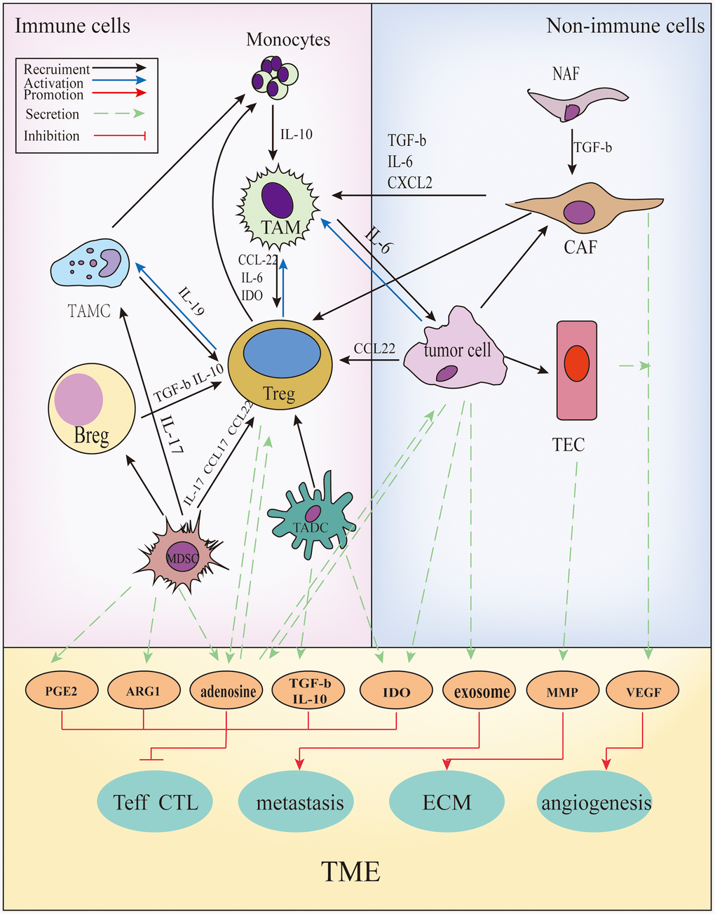 Figure 3. The cross-talks between immune and non-immune cells within the TME. In the TME, all kinds of cells secrete soluble molecules and interact with each other, such as prostaglandin E2(PGE2), arginase-1(ARG1), adenosine, transforming growth factor β(TGF-β), interleukin (IL)-10, indoleamine2,3-dioxygenase (IDO), exosomes, matrix metalloproteinase (MMPs), vascular endothelial growth factor (VEGF), and so on. These factors inhibit the function and proliferation of CD4+/ CD8+ T cells, promote angiogenesis, extracellular matrix (ECM) remodeling and tumor metastasis.