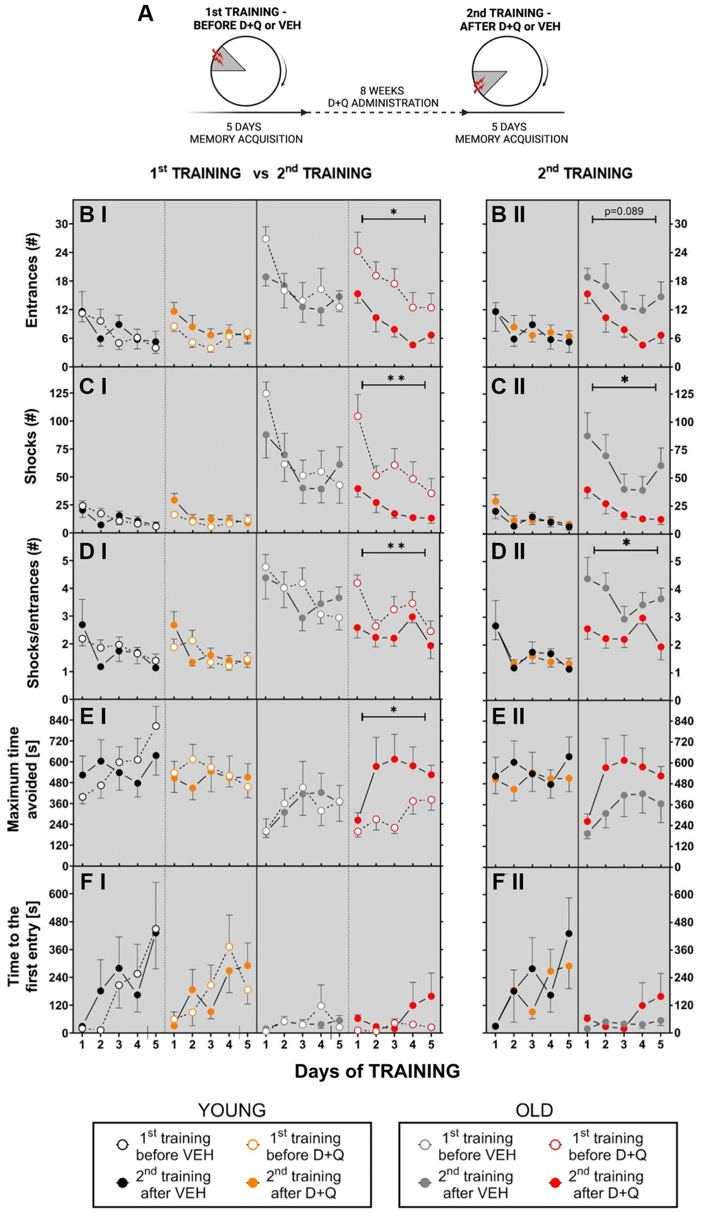Figure 1. Treatment with D+Q improved cognitive ability in aged rats tested in the AAPAT on spatial memory. (A) Schematic diagram of the experimental design. Experiments consisted of 2 trainings, each with a different position of to-be-avoided place. The number of entries into the shock place (# of entries, B), the number of shocks (# shocks, C) and the number of shocks per one entry ratio (Shocks/entrance, D), together with maximum time avoided (E) and time to the first entry (F) during place avoidance training reflect changes in the learning abilities and memory in aged rats. Performance of place avoidance by young (3-mo old; YOUNG; N = 7) (black - vehicle, orange - D+Q) and aged (22-mo old; OLD; N = 7) (grey - vehicle, red - D+Q) rats in the AAPAT before and after 8 weeks of treatment with D+Q or vehicle (VEH) by oral gavage. Figures labeled with “I” depict comparison between 1st TRAINING and 2nd TRAINING, “II” between VEH and D+Q groups results of the 2nd TRAINING. The results are expressed as mean ± SEM, N = 7, *p < 0.05, **p < 0.01, ***p < 0.001. Data obtained for groups at consecutive trials were compared using repeated measures two-way ANOVA (2 groups and 5 days).