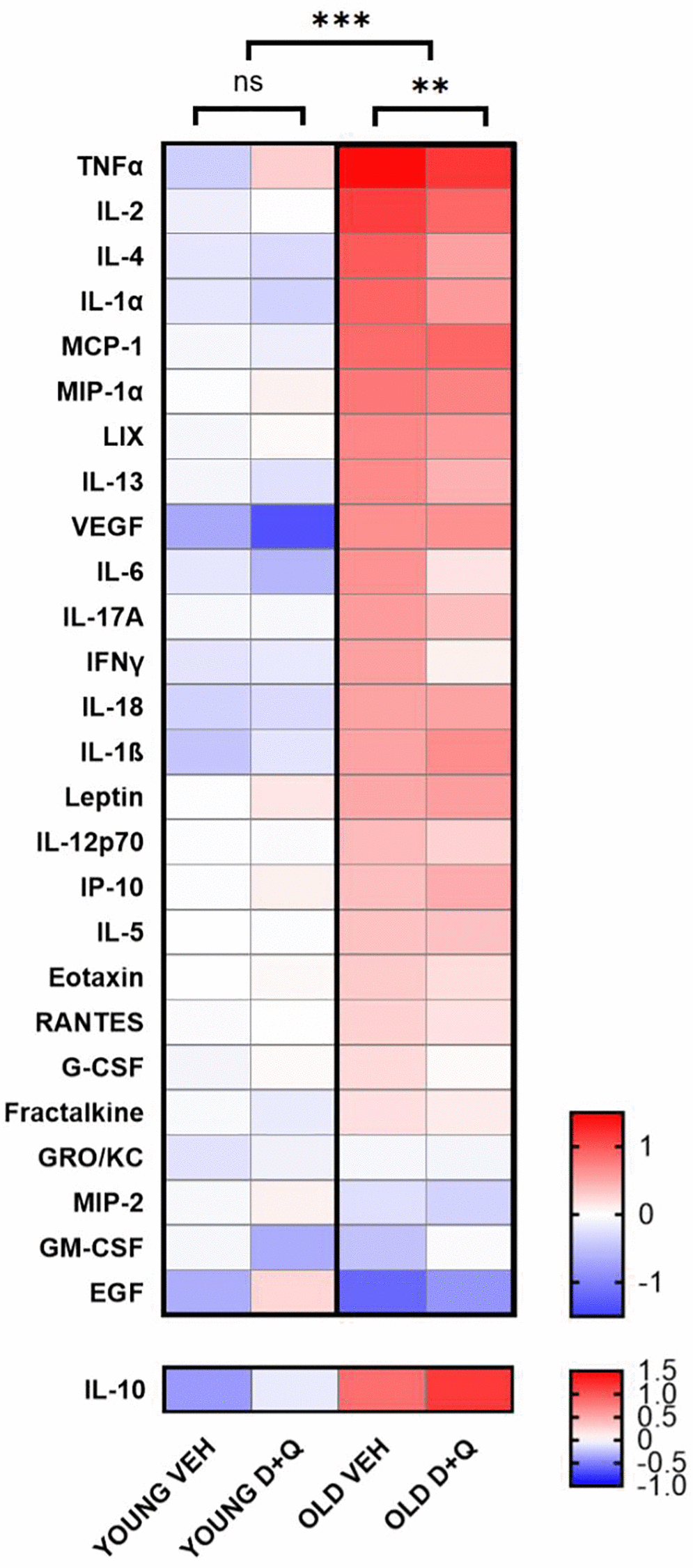Figure 2. D+Q treatment reduces peripheral inflammation in aged rats. The heat map depicts cytokines and growth factor levels in blood serum collected after the final behavioral test from young and aged (6-month-old and 25-month-old respectively at the time of collection) rats treated with D+Q or vehicle (VEH). The results were normalized to the average of the young vehicle group. IL-10 as anti-inflammatory cytokine has been presented separately. The data were analyzed using two-way ANOVA; n = 7–8, *p < 0.05, **p < 0.01, ***p < 0.001.