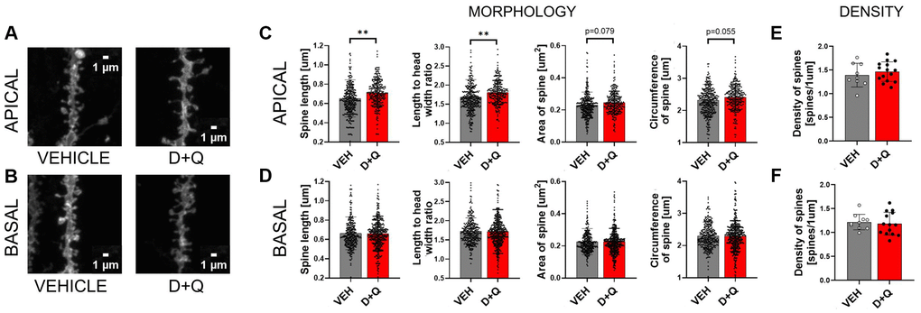 Synaptic plasticity is the activity-dependent modification of signal transmission between neurons. Changes in the synaptic transmission are associated with morphological alterations of the dendritic spines which constitute the postsynaptic part of the excitatory synapse. Synaptic plasticity, particularly in the hippocampal region, is critical for learning and memory formation. We hypothesized that improvement of cognitive abilities upon D+Q treatment should therefore be associated with changes in synaptic plasticity. To test this hypothesis, we analyzed dendritic spines morphology and density in DiI stained sections of hippocampus from aged vehicle and D+Q treated rats (Figure 3A and 3B). We found that dendritic spines on apical dendrites of the CA1 neurons underwent morphological changes after treatment with D+Q. The spines were longer (p = 0.008), and the ratio between the spine length and head width was significantly higher (p = 0.002) compared to the vehicle treated group. Moreover, we found a trend toward increase of the overall size of spines in the D+Q group as measured by the circumference and area of spines (circumference p = 0.055; area p = 0.079) (Figure 3C). Interestingly, these changes were specific to apical dendrites as we did not observe similar changes in basal dendrites of CA1 neurons between D+Q and vehicle groups of aged rats (length p = 0.209; length to width p = 0.453; circumference p = 0.364; area p = 0.186) (Figure 3D). Dendritic spines density was not affected by D+Q treatment neither in the stratum oriens (p = 0.692) nor in the stratum radiatum (p = 0.443) (Figure 3E and 3F).