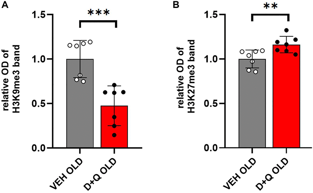 Altered epigenetic profile has been associated with age-dependent disorders. Methylation of histones H3 typically occurring at specific lysine (K) residues, such as H3K9, H3K27 regulates chromatin state and plays an important role in the regulation of gene expression. In particular, trimethylation of H3K9 (H3K9me3) and H3K27 (H3K27me3) which regulates silent heterochromatin stability has been implicated in age-dependent cognitive impairment [7, 8]. We hypothesized that rejuvenating effects of D+Q would affect the histone H3 methylation profile. To test this hypothesis, we performed Western blot analysis of histone extracts from hippocampal lysates of aged D+Q or vehicle treated rats. Our results showed a significant decrease in H3K9me3 levels relative to the total H3 in aged animals treated with D+Q (p < 0.001) (Figure 4A). Conversely, the levels of H3K27me3 were significantly higher in aged animals treated with D+Q compared to vehicle treated rats (p = 0.009) (Figure 4B).