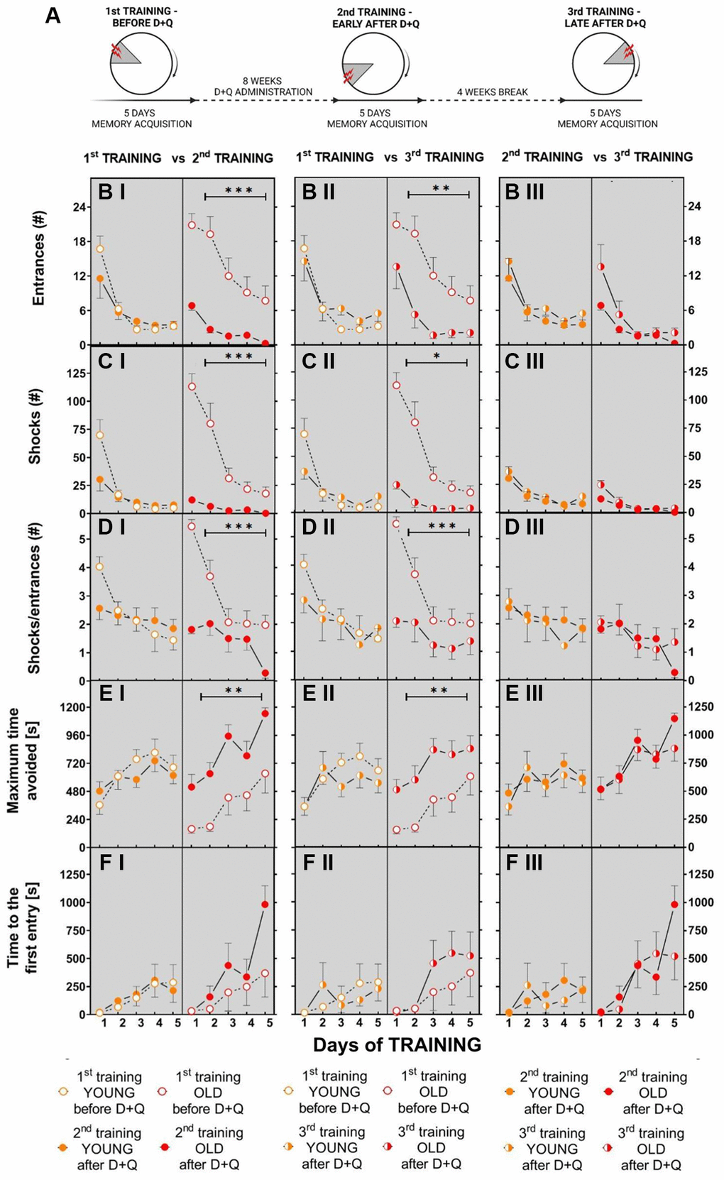 Figure 5. Treatment with D+Q significantly improves cognitive abilities in aged rats in spatial memory task in the AAPAT on spatial memory for at least 5 weeks after treatment termination. (A) Schematic diagram of the experimental design in which rats are subjected to the training 3 times, each time with a new position of the to-be-avoided place. The number of entries into the shock place (# of entries, B I–III), the number of shocks (# shocks, C I–III) and number of shocks per one entry (Shocks/entrance, D I–III) together with maximum time avoided (E I–III) and time to the first entry (F I–III) during place avoidance training reflect changes in the learning abilities and memory in aged rats not only early after D+Q treatment (2nd TRAINING) but also after additional 4 weeks (3rd TRAINING). Performance of place avoidance by young (3-month old; YOUNG; orange color) and aged (18-month old; OLD; red color) rats in the AAPAT before and after 8 weeks of treatment with D+Q by oral gavage. Figures labeled with “I” depict comparison between 1st TRAINING and 2nd TRAINING, “II” between 1st TRAINING and 3rd TRAINING, whereas “III” depict comparison between 2nd TRAINING and 3rd TRAINING. The results are expressed as mean ± SEM, N = 7, *p < 0.05, **p < 0.01, ***p < 0.001. Data obtained for groups at consecutive trials were compared using repeated measures two-way ANOVA.