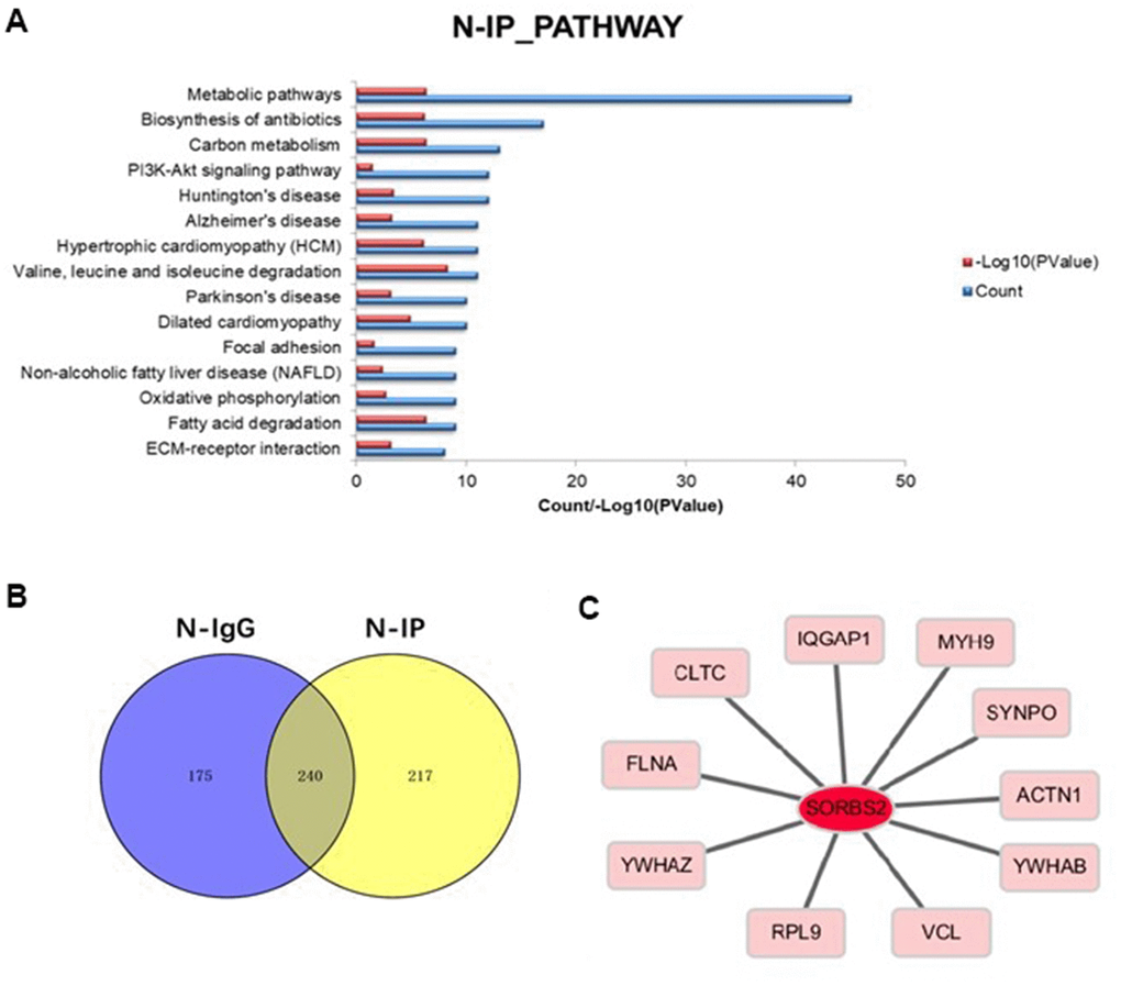 The protein SORBS2 was specifically overexpressed only in LVNC and may have some relationship with this disease. For the first time, we used normal myocardial tissue to conduct IP experiments on SORBS2 and screened the interacting proteins highly correlated with SORBS2.